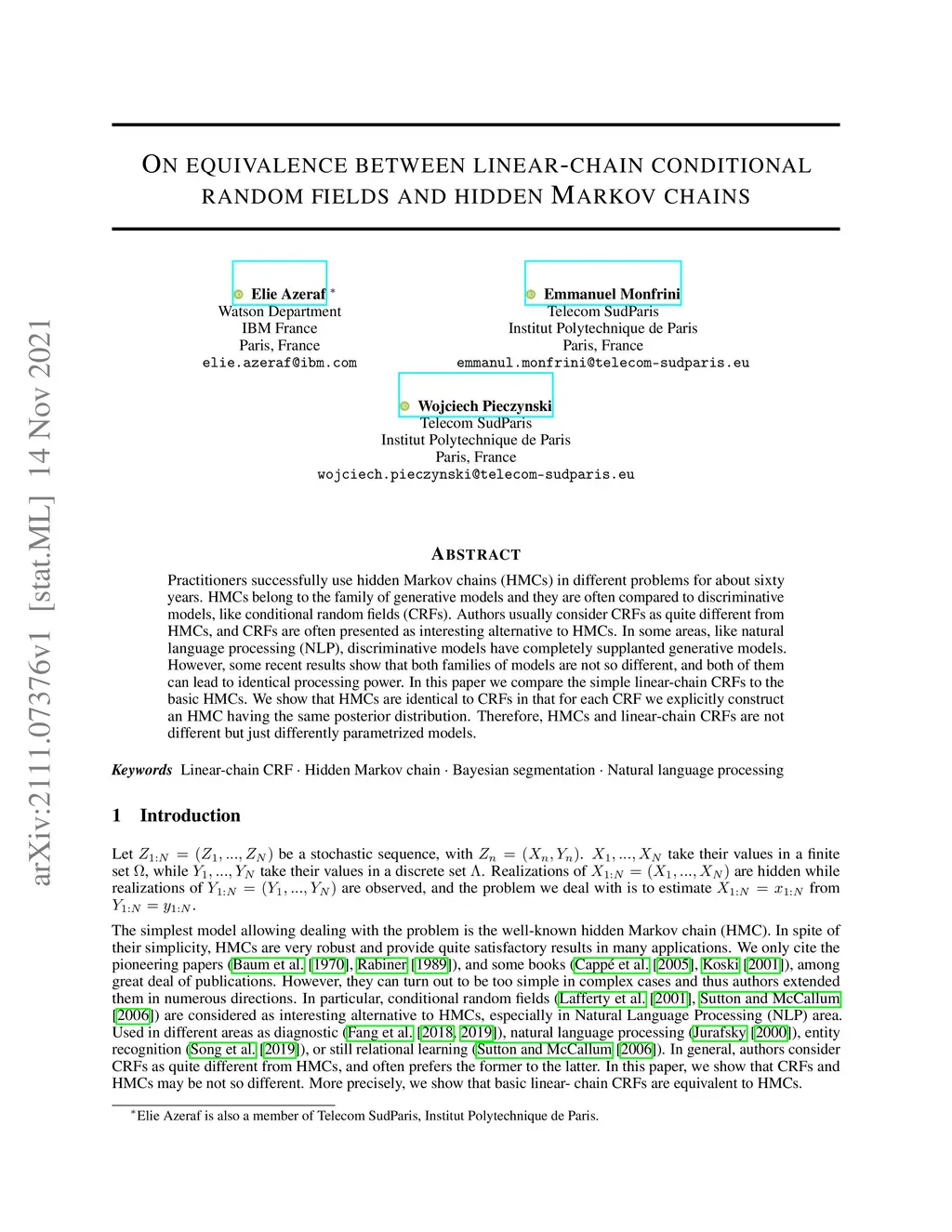 Practitioners successfully use hidden Markov chains (HMCs) in different problems for about sixty years. HMCs belong to the family of generative models and they are often compared to discriminative models, like conditional random fields (CRFs). Authors usually consider CRFs as quite different from HMCs, and CRFs are often presented as interesting alternative to HMCs. In some areas, like natural language processing (NLP), discriminative models have completely supplanted generative models. However, some recent results show that both families of models are not so different, and both of them can lead to identical processing power. In this paper we compare the simple linear-chain CRFs to the basic HMCs. We show that HMCs are identical to CRFs in that for each CRF we explicitly construct an HMC having the same posterior distribution. Therefore, HMCs and linear-chain CRFs are not different but just differently parametrized models.