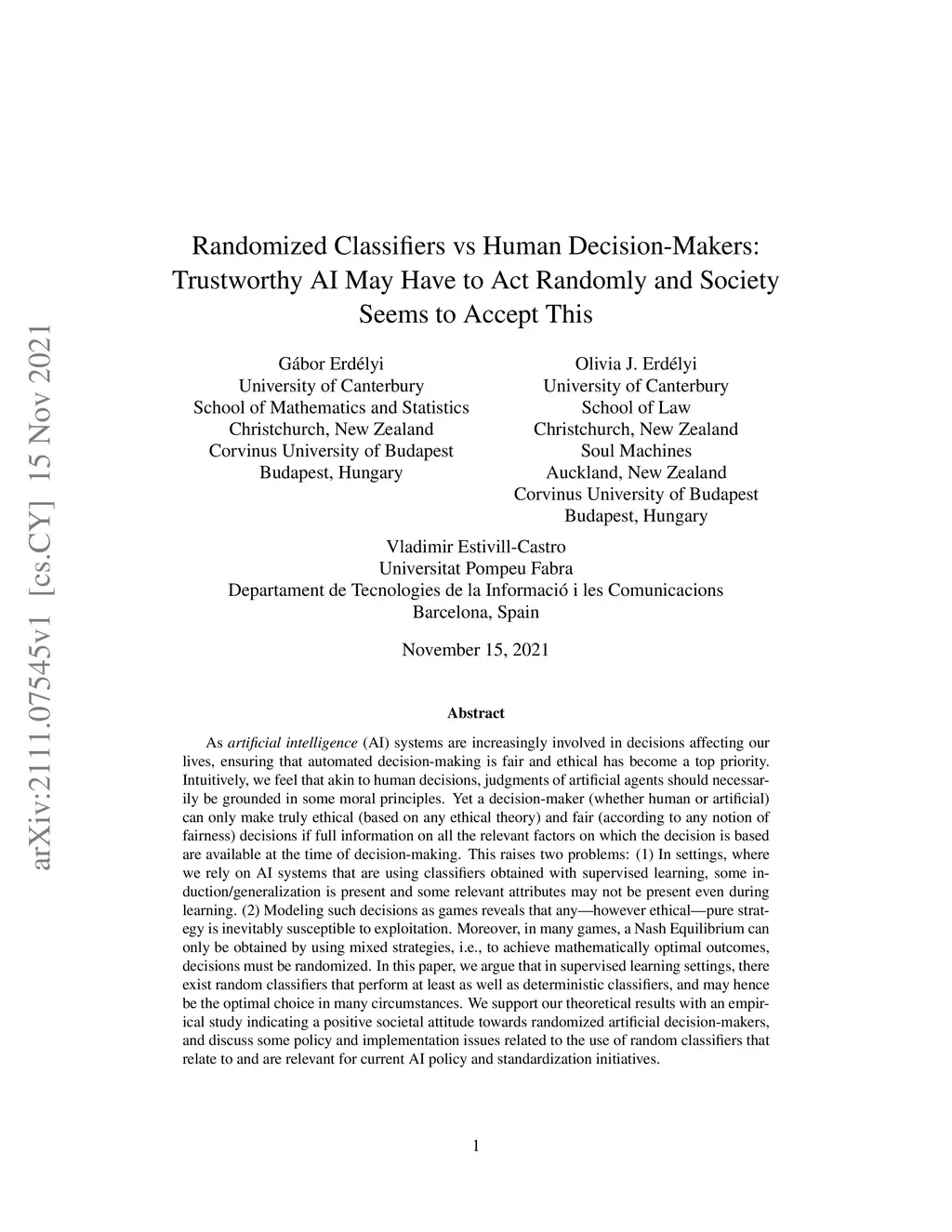 Randomized Classifiers vs Human Decision-Makers: Trustworthy AI May Have