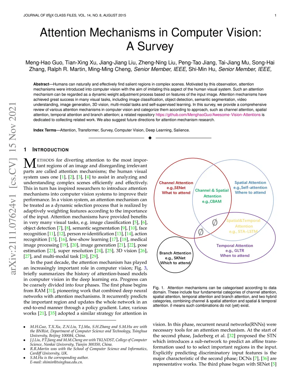 Humans can naturally and effectively find salient regions in complex scenes. Motivated by this observation, attention mechanisms were introduced into computer vision with the aim of imitating this aspect of the human visual system. Such an attention mechanism can be regarded as a dynamic weight adjustment process based on features of the input image. Attention mechanisms have achieved great success in many visual tasks, including image classification, object detection, semantic segmentation, video understanding, image generation, 3D vision, multi-modal tasks and self-supervised learning. In this survey, we provide a comprehensive review of various attention mechanisms in computer vision and categorize them according to approach, such as channel attention, spatial attention, temporal attention and branch attention; a related repository https://github.com/MenghaoGuo/Awesome-Vision-Attentions is dedicated to collecting related work. We also suggest future directions for attention mechanism research.