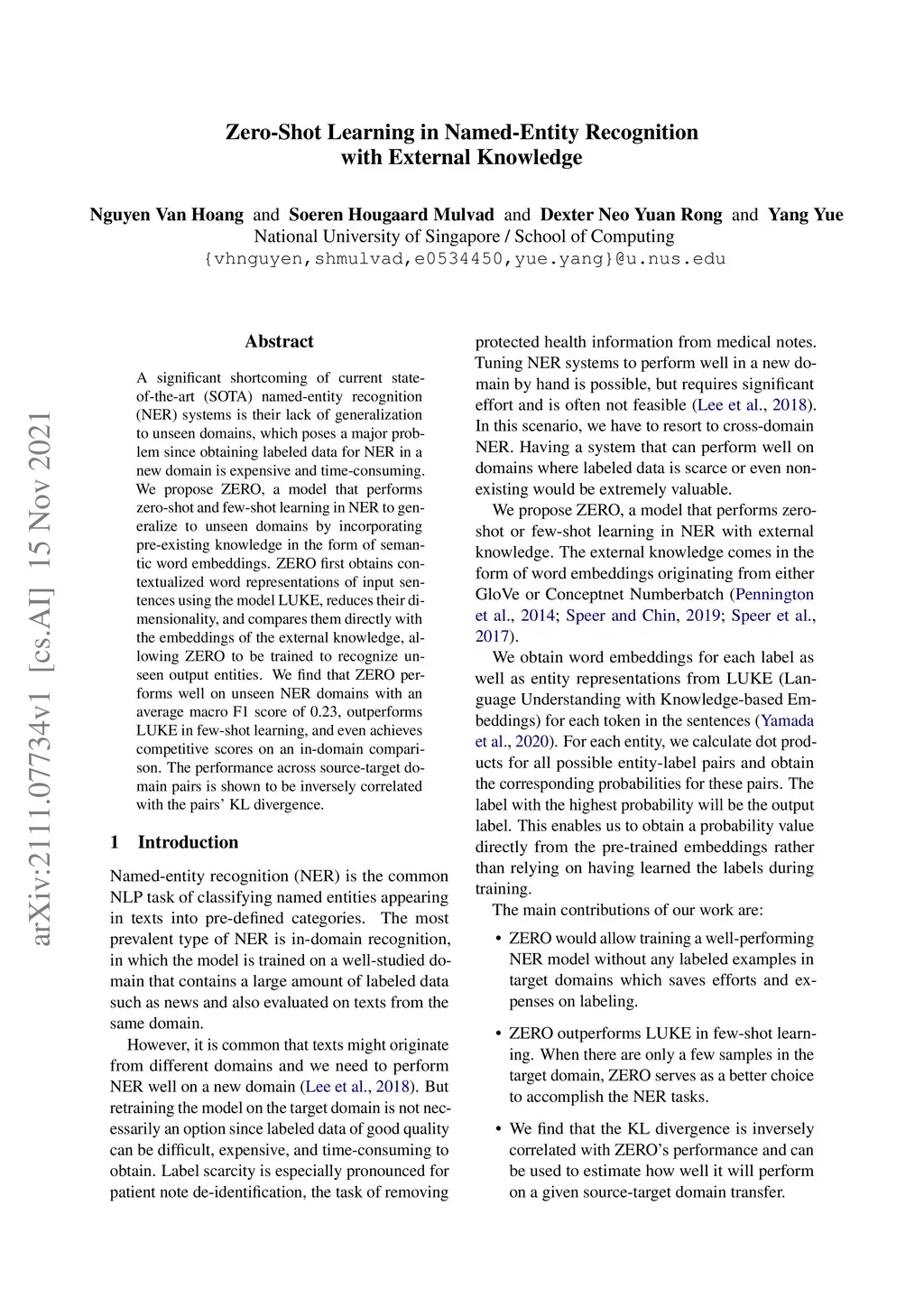 A significant shortcoming of current state-of-the-art (SOTA) named-entity recognition (NER) systems is their lack of generalization to unseen domains, which poses a major problem since obtaining labeled data for NER in a new domain is expensive and time-consuming. We propose ZERO, a model that performs zero-shot and few-shot learning in NER to generalize to unseen domains by incorporating pre-existing knowledge in the form of semantic word embeddings. ZERO first obtains contextualized word representations of input sentences using the model LUKE, reduces their dimensionality, and compares them directly with the embeddings of the external knowledge, allowing ZERO to be trained to recognize unseen output entities. We find that ZERO performs well on unseen NER domains with an average macro F1 score of 0.23, outperforms LUKE in few-shot learning, and even achieves competitive scores on an in-domain comparison. The performance across source-target domain pairs is shown to be inversely correlated with the pairs' KL divergence.