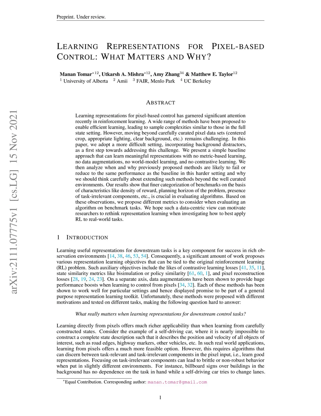 Learning Representations for Pixel-based Control: What Matters and Why?