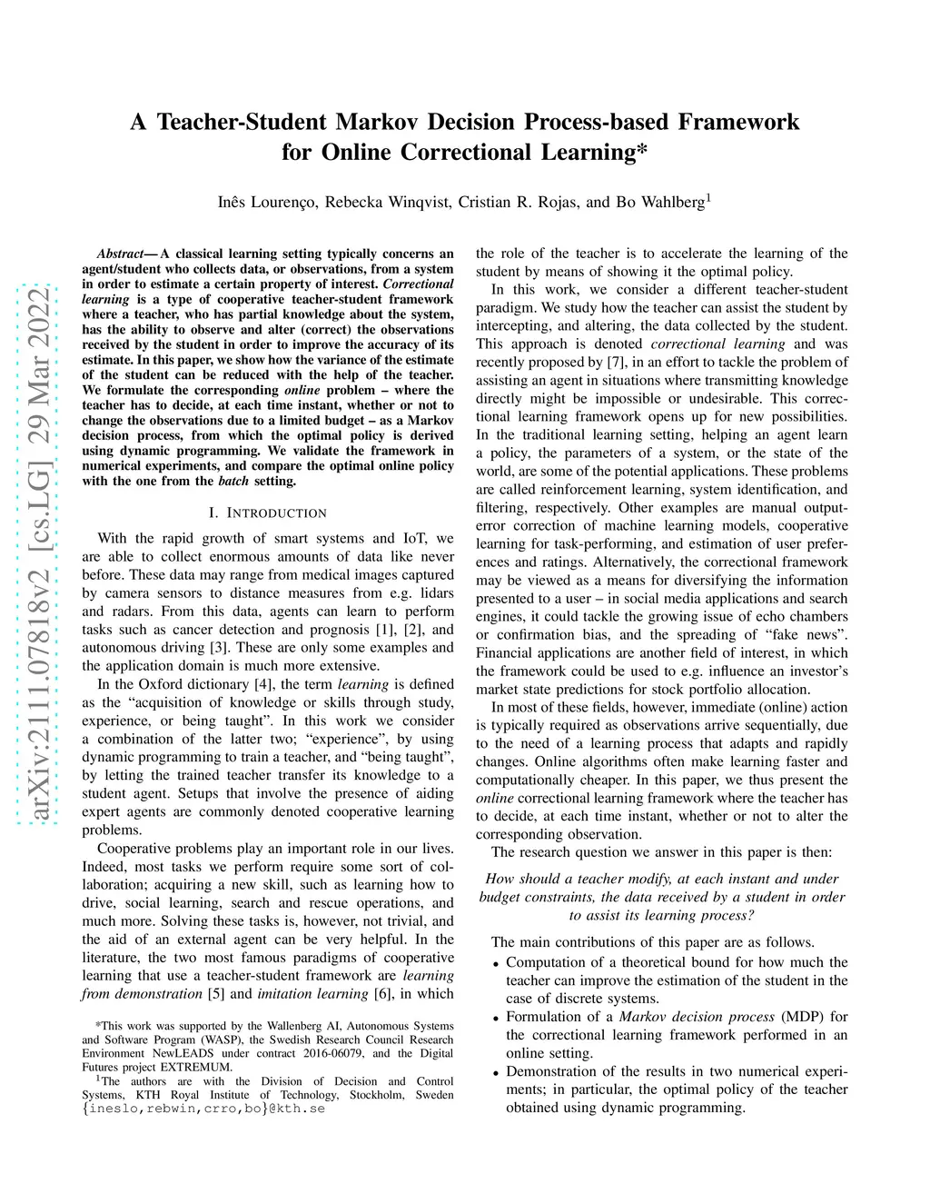 A classical learning setting typically concerns an agent/student who collects data, or observations, from a system in order to estimate a certain property of interest. Correctional learning is a type of cooperative teacher-student framework where a teacher, who has partial knowledge about the system, has the ability to observe and alter (correct) the observations received by the student in order to improve the accuracy of its estimate. In this paper, we show how the variance of the estimate of the student can be reduced with the help of the teacher. We formulate the corresponding online problem - where the teacher has to decide, at each time instant, whether or not to change the observations due to a limited budget - as a Markov decision process, from which the optimal policy is derived using dynamic programming. We validate the framework in numerical experiments, and compare the optimal online policy with the one from the batch setting.