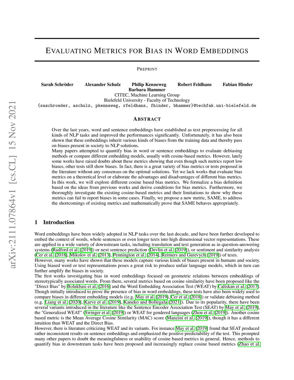 Over the last years, word and sentence embeddings have established as text preprocessing for all kinds of NLP tasks and improved the performances significantly. Unfortunately, it has also been shown that these embeddings inherit various kinds of biases from the training data and thereby pass on biases present in society to NLP solutions. Many papers attempted to quantify bias in word or sentence embeddings to evaluate debiasing methods or compare different embedding models, usually with cosine-based metrics. However, lately some works have raised doubts about these metrics showing that even though such metrics report low biases, other tests still show biases. In fact, there is a great variety of bias metrics or tests proposed in the literature without any consensus on the optimal solutions. Yet we lack works that evaluate bias metrics on a theoretical level or elaborate the advantages and disadvantages of different bias metrics. In this work, we will explore different cosine based bias metrics. We formalize a bias definition based on the ideas from previous works and derive conditions for bias metrics. Furthermore, we thoroughly investigate the existing cosine-based metrics and their limitations to show why these metrics can fail to report biases in some cases. Finally, we propose a new metric, SAME, to address the shortcomings of existing metrics and mathematically prove that SAME behaves appropriately.