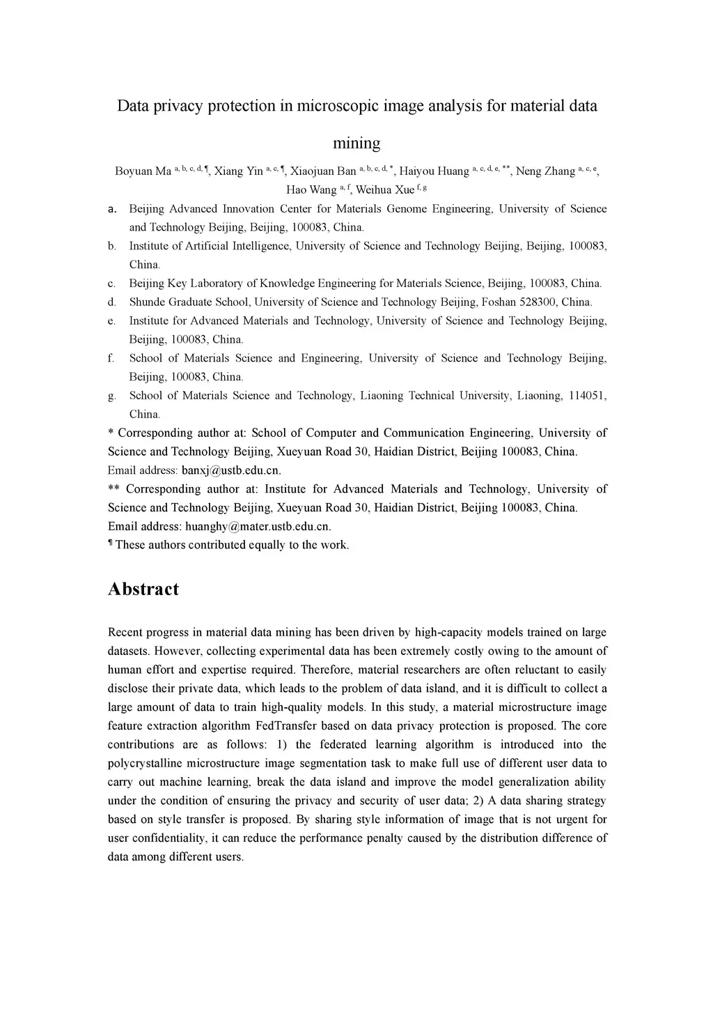 Recent progress in material data mining has been driven by high-capacity models trained on large datasets. However, collecting experimental data has been extremely costly owing to the amount of human effort and expertise required. Therefore, material researchers are often reluctant to easily disclose their private data, which leads to the problem of data island, and it is difficult to collect a large amount of data to train high-quality models. In this study, a material microstructure image feature extraction algorithm FedTransfer based on data privacy protection is proposed. The core contributions are as follows: 1) the federated learning algorithm is introduced into the polycrystalline microstructure image segmentation task to make full use of different user data to carry out machine learning, break the data island and improve the model generalization ability under the condition of ensuring the privacy and security of user data; 2) A data sharing strategy based on style transfer is proposed. By sharing style information of images that is not urgent for user confidentiality, it can reduce the performance penalty caused by the distribution difference of data among different users.