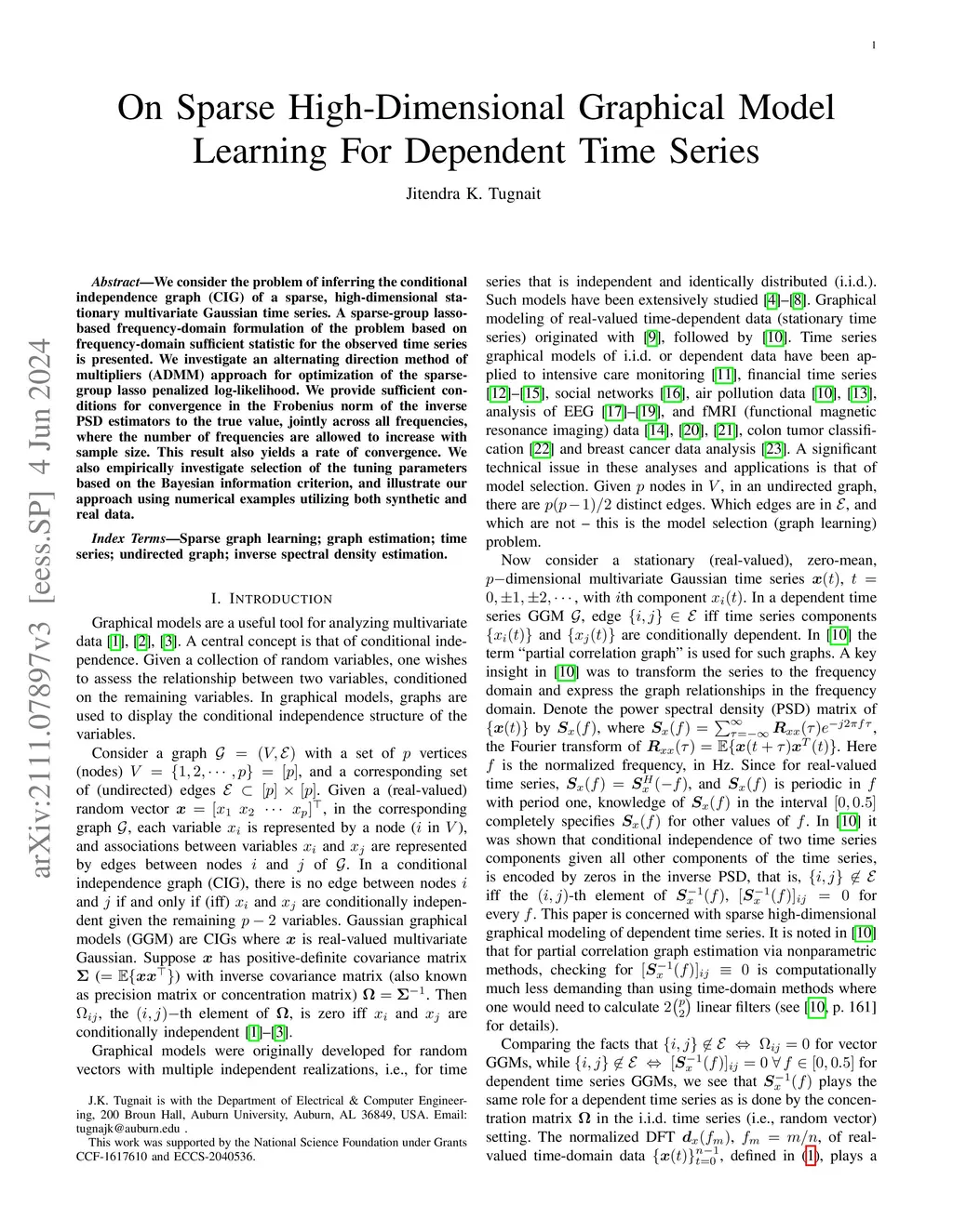 We consider the problem of inferring the conditional independence graph (CIG) of a sparse, high-dimensional stationary multivariate Gaussian time series. A sparse-group lasso-based frequency-domain formulation of the problem based on frequency-domain sufficient statistic for the observed time series is presented. We investigate an alternating direction method of multipliers (ADMM) approach for optimization of the sparse-group lasso penalized log-likelihood. We provide sufficient conditions for convergence in the Frobenius norm of the inverse PSD estimators to the true value, jointly across all frequencies, where the number of frequencies are allowed to increase with sample size. This results also yields a rate of convergence. We also empirically investigate selection of the tuning parameters based on Bayesian information criterion, and illustrate our approach using numerical examples utilizing both synthetic and real data.