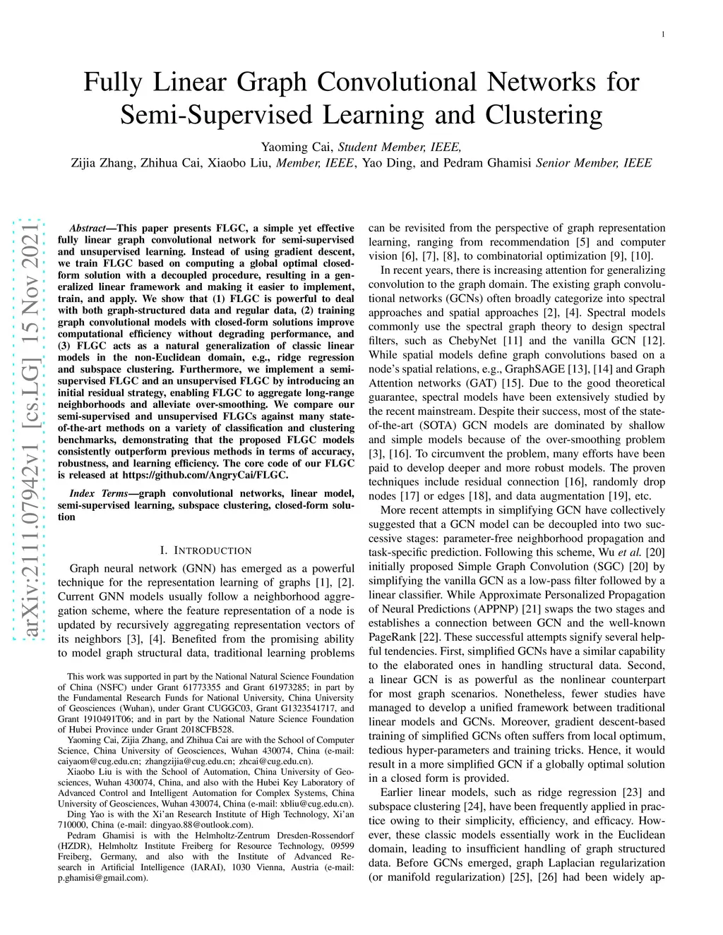 This paper presents FLGC, a simple yet effective fully linear graph convolutional network for semi-supervised and unsupervised learning. Instead of using gradient descent, we train FLGC based on computing a global optimal closed-form solution with a decoupled procedure, resulting in a generalized linear framework and making it easier to implement, train, and apply. We show that (1) FLGC is powerful to deal with both graph-structured data and regular data, (2) training graph convolutional models with closed-form solutions improve computational efficiency without degrading performance, and (3) FLGC acts as a natural generalization of classic linear models in the non-Euclidean domain, e.g., ridge regression and subspace clustering. Furthermore, we implement a semi-supervised FLGC and an unsupervised FLGC by introducing an initial residual strategy, enabling FLGC to aggregate long-range neighborhoods and alleviate over-smoothing. We compare our semi-supervised and unsupervised FLGCs against many state-of-the-art methods on a variety of classification and clustering benchmarks, demonstrating that the proposed FLGC models consistently outperform previous methods in terms of accuracy, robustness, and learning efficiency. The core code of our FLGC is released at https://github.com/AngryCai/FLGC.