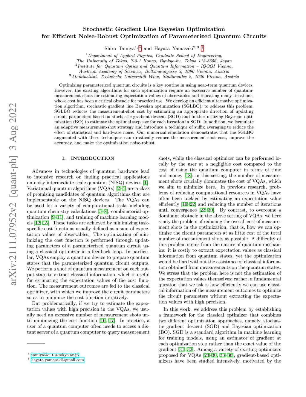Optimizing parameterized quantum circuits is a key routine in using near-term quantum devices. However, the existing algorithms for such optimization require an excessive number of quantum-measurement shots for estimating expectation values of observables and repeating many iterations, whose cost has been a critical obstacle for practical use. We develop an efficient alternative optimization algorithm, stochastic gradient line Bayesian optimization (SGLBO), to address this problem. SGLBO reduces the measurement-shot cost by estimating an appropriate direction of updating circuit parameters based on stochastic gradient descent (SGD) and further utilizing Bayesian optimization (BO) to estimate the optimal step size for each iteration in SGD. In addition, we formulate an adaptive measurement-shot strategy and introduce a technique of suffix averaging to reduce the effect of statistical and hardware noise. Our numerical simulation demonstrates that the SGLBO augmented with these techniques can drastically reduce the measurement-shot cost, improve the accuracy, and make the optimization noise-robust.