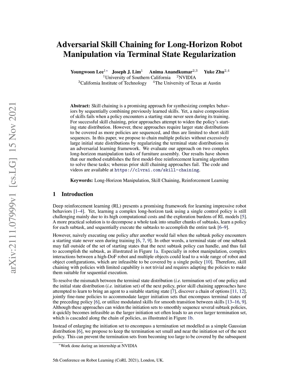 Skill chaining is a promising approach for synthesizing complex behaviors by sequentially combining previously learned skills. Yet, a naive composition of skills fails when a policy encounters a starting state never seen during its training. For successful skill chaining, prior approaches attempt to widen the policy's starting state distribution. However, these approaches require larger state distributions to be covered as more policies are sequenced, and thus are limited to short skill sequences. In this paper, we propose to chain multiple policies without excessively large initial state distributions by regularizing the terminal state distributions in an adversarial learning framework. We evaluate our approach on two complex long-horizon manipulation tasks of furniture assembly. Our results have shown that our method establishes the first model-free reinforcement learning algorithm to solve these tasks; whereas prior skill chaining approaches fail. The code and videos are available at https://clvrai.com/skill-chaining