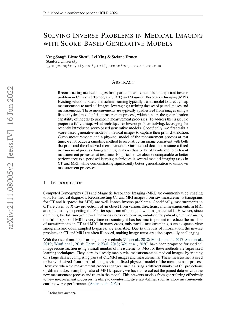 Reconstructing medical images from partial measurements is an important inverse problem in Computed Tomography (CT) and Magnetic Resonance Imaging (MRI). Existing solutions based on machine learning typically train a model to directly map measurements to medical images, leveraging a training dataset of paired images and measurements. These measurements are typically synthesized from images using a fixed physical model of the measurement process, which hinders the generalization capability of models to unknown measurement processes. To address this issue, we propose a fully unsupervised technique for inverse problem solving, leveraging the recently introduced score-based generative models. Specifically, we first train a score-based generative model on medical images to capture their prior distribution. Given measurements and a physical model of the measurement process at test time, we introduce a sampling method to reconstruct an image consistent with both the prior and the observed measurements. Our method does not assume a fixed measurement process during training, and can thus be flexibly adapted to different measurement processes at test time. Empirically, we observe comparable or better performance to supervised learning techniques in several medical imaging tasks in CT and MRI, while demonstrating significantly better generalization to unknown measurement processes.