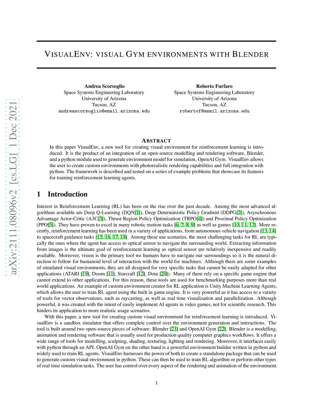 In this paper VisualEnv, a new tool for creating visual environment for reinforcement learning is introduced. It is the product of an integration of an open-source modelling and rendering software, Blender, and a python module used to generate environment model for simulation, OpenAI Gym. VisualEnv allows the user to create custom environments with photorealistic rendering capabilities and full integration with python. The framework is described and tested on a series of example problems that showcase its features for training reinforcement learning agents.