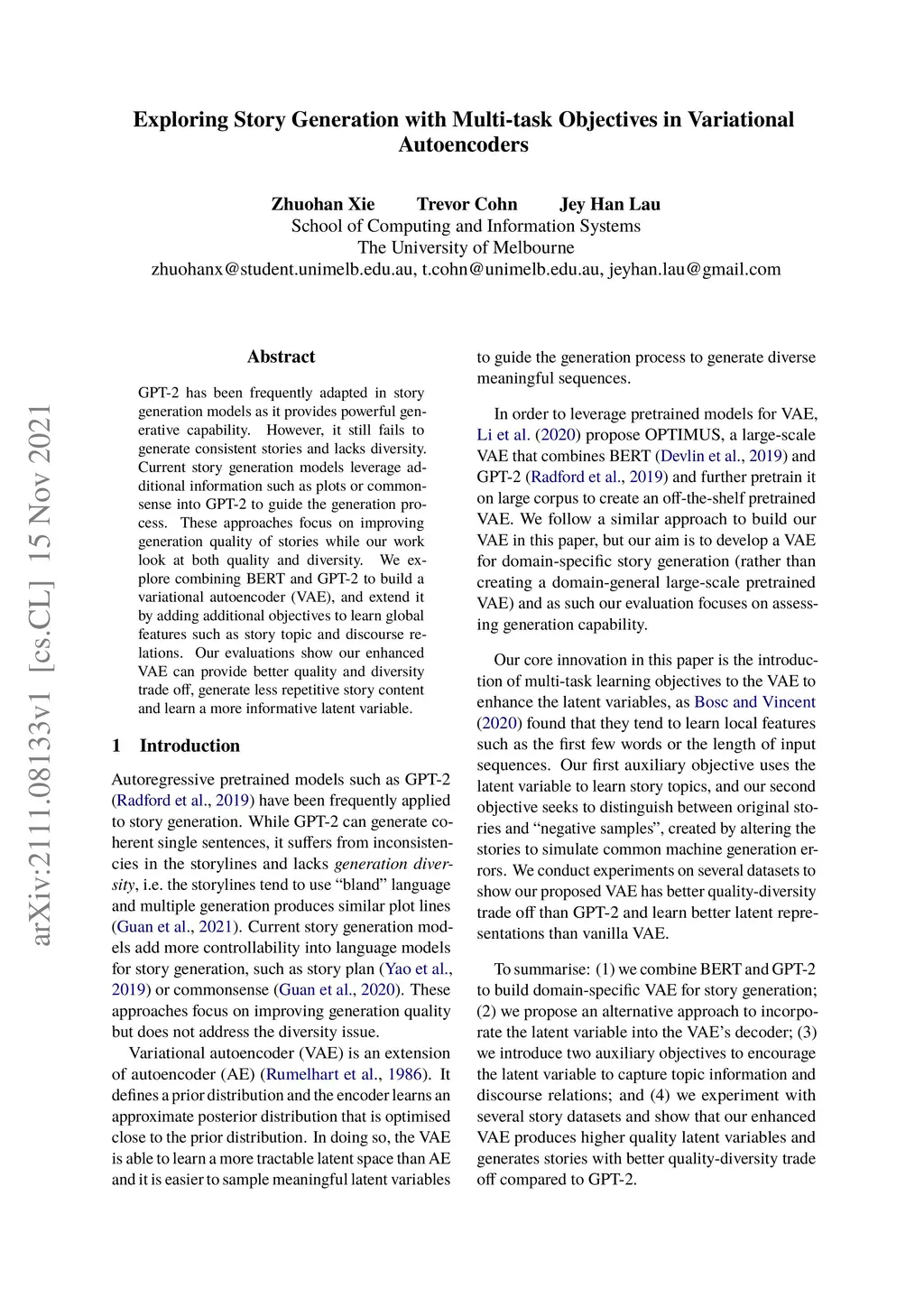 GPT-2 has been frequently adapted in story generation models as it provides powerful generative capability. However, it still fails to generate consistent stories and lacks diversity. Current story generation models leverage additional information such as plots or commonsense into GPT-2 to guide the generation process. These approaches focus on improving generation quality of stories while our work look at both quality and diversity. We explore combining BERT and GPT-2 to build a variational autoencoder (VAE), and extend it by adding additional objectives to learn global features such as story topic and discourse relations. Our evaluations show our enhanced VAE can provide better quality and diversity trade off, generate less repetitive story content and learn a more informative latent variable.