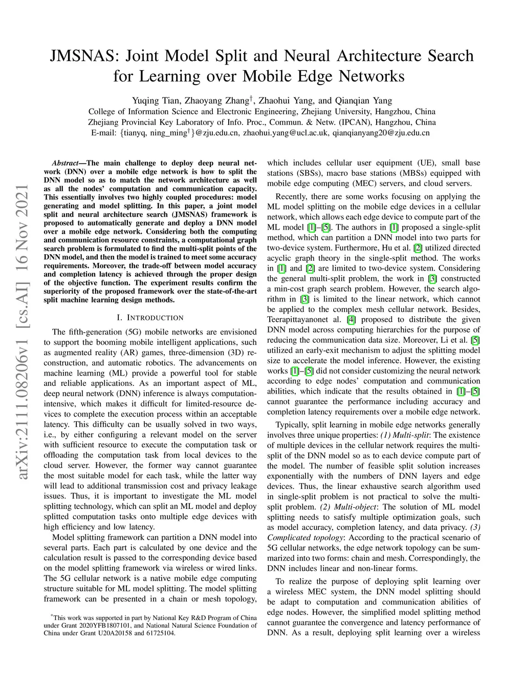 The main challenge to deploy deep neural network (DNN) over a mobile edge network is how to split the DNN model so as to match the network architecture as well as all the nodes' computation and communication capacity. This essentially involves two highly coupled procedures: model generating and model splitting. In this paper, a joint model split and neural architecture search (JMSNAS) framework is proposed to automatically generate and deploy a DNN model over a mobile edge network. Considering both the computing and communication resource constraints, a computational graph search problem is formulated to find the multi-split points of the DNN model, and then the model is trained to meet some accuracy requirements. Moreover, the trade-off between model accuracy and completion latency is achieved through the proper design of the objective function. The experiment results confirm the superiority of the proposed framework over the state-of-the-art split machine learning design methods.