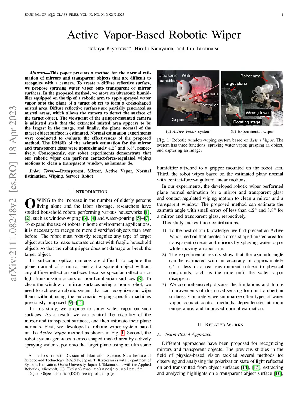 This paper presents a method for the normal estimation of mirrors and transparent objects that are difficult to recognize with a camera. To create a diffuse reflective surface, we propose spraying water vapor onto transparent or mirror surfaces. In the proposed method, we move an ultrasonic humidifier equipped on the tip of a robotic arm to apply sprayed water vapor onto the plane of a target object to form a cross-shaped misted area. Diffuse reflective surfaces are partially generated as misted areas, which allows the camera to detect the surface of the target object. The viewpoint of the gripper-mounted camera is adjusted such that the extracted misted area appears to be the largest in the image, and finally, the plane normal of the target object surface is estimated. Normal estimation experiments were conducted to evaluate the effectiveness of the proposed method. The RMSEs of the azimuth estimation for the mirror and transparent glass were approximately 4.2 and 5.8 degrees, respectively. Consequently, our robot experiments demonstrate that our robotic wiper can perform contact-force-regulated wiping motions to clean a transparent window, as humans do.