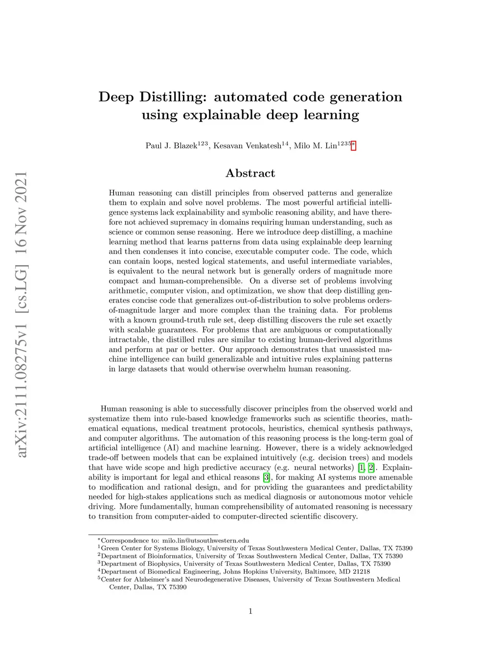 Human reasoning can distill principles from observed patterns and generalize them to explain and solve novel problems. The most powerful artificial intelligence systems lack explainability and symbolic reasoning ability, and have therefore not achieved supremacy in domains requiring human understanding, such as science or common sense reasoning. Here we introduce deep distilling, a machine learning method that learns patterns from data using explainable deep learning and then condenses it into concise, executable computer code. The code, which can contain loops, nested logical statements, and useful intermediate variables, is equivalent to the neural network but is generally orders of magnitude more compact and human-comprehensible. On a diverse set of problems involving arithmetic, computer vision, and optimization, we show that deep distilling generates concise code that generalizes out-of-distribution to solve problems orders-of-magnitude larger and more complex than the training data. For problems with a known ground-truth rule set, deep distilling discovers the rule set exactly with scalable guarantees. For problems that are ambiguous or computationally intractable, the distilled rules are similar to existing human-derived algorithms and perform at par or better. Our approach demonstrates that unassisted machine intelligence can build generalizable and intuitive rules explaining patterns in large datasets that would otherwise overwhelm human reasoning.