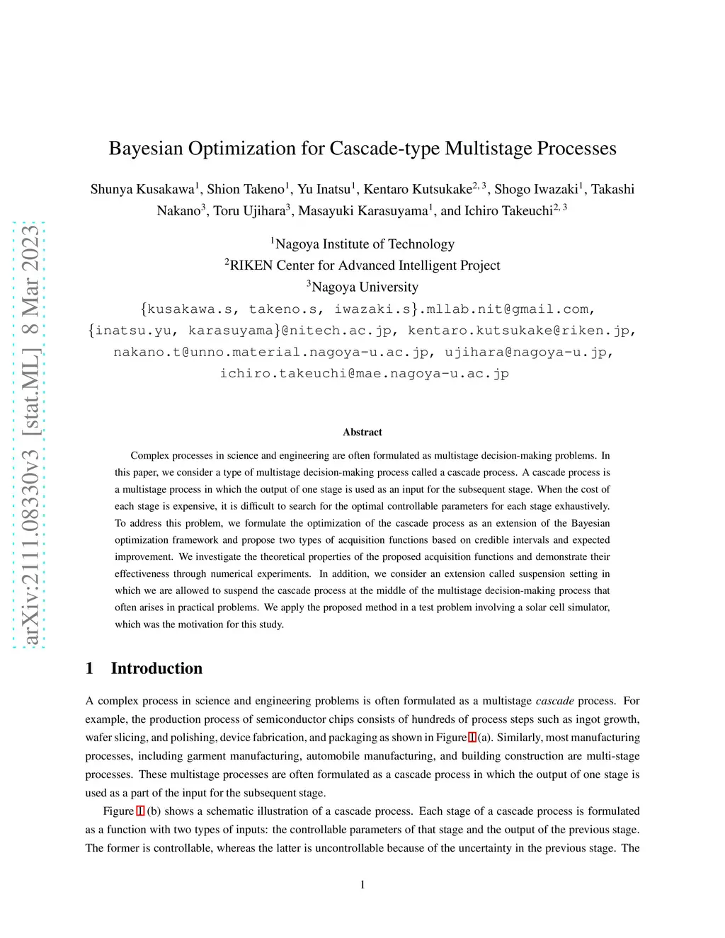Complex processes in science and engineering are often formulated as multistage decision-making problems. In this paper, we consider a type of multistage decision-making process called a cascade process. A cascade process is a multistage process in which the output of one stage is used as an input for the subsequent stage. When the cost of each stage is expensive, it is difficult to search for the optimal controllable parameters for each stage exhaustively. To address this problem, we formulate the optimization of the cascade process as an extension of the Bayesian optimization framework and propose two types of acquisition functions based on credible intervals and expected improvement. We investigate the theoretical properties of the proposed acquisition functions and demonstrate their effectiveness through numerical experiments. In addition, we consider an extension called suspension setting in which we are allowed to suspend the cascade process at the middle of the multistage decision-making process that often arises in practical problems. We apply the proposed method in a test problem involving a solar cell simulator, which was the motivation for this study.