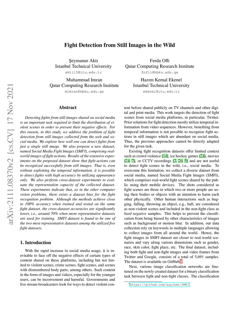 Detecting fights from still images shared on social media is an important task required to limit the distribution of violent scenes in order to prevent their negative effects. For this reason, in this study, we address the problem of fight detection from still images collected from the web and social media. We explore how well one can detect fights from just a single still image. We also propose a new dataset, named Social Media Fight Images (SMFI), comprising real-world images of fight actions. Results of the extensive experiments on the proposed dataset show that fight actions can be recognized successfully from still images. That is, even without exploiting the temporal information, it is possible to detect fights with high accuracy by utilizing appearance only. We also perform cross-dataset experiments to evaluate the representation capacity of the collected dataset. These experiments indicate that, as in the other computer vision problems, there exists a dataset bias for the fight recognition problem. Although the methods achieve close to 100% accuracy when trained and tested on the same fight dataset, the cross-dataset accuracies are significantly lower, i.e., around 70% when more representative datasets are used for training. SMFI dataset is found to be one of the two most representative datasets among the utilized five fight datasets.