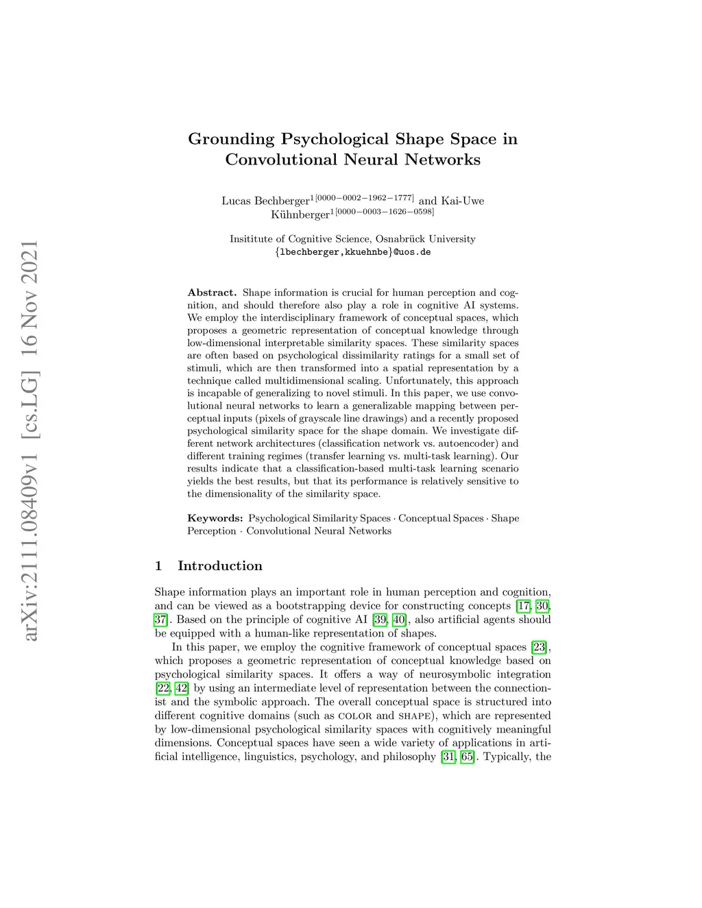 Shape information is crucial for human perception and cognition, and should therefore also play a role in cognitive AI systems. We employ the interdisciplinary framework of conceptual spaces, which proposes a geometric representation of conceptual knowledge through low-dimensional interpretable similarity spaces. These similarity spaces are often based on psychological dissimilarity ratings for a small set of stimuli, which are then transformed into a spatial representation by a technique called multidimensional scaling. Unfortunately, this approach is incapable of generalizing to novel stimuli. In this paper, we use convolutional neural networks to learn a generalizable mapping between perceptual inputs (pixels of grayscale line drawings) and a recently proposed psychological similarity space for the shape domain. We investigate different network architectures (classification network vs. autoencoder) and different training regimes (transfer learning vs. multi-task learning). Our results indicate that a classification-based multi-task learning scenario yields the best results, but that its performance is relatively sensitive to the dimensionality of the similarity space.