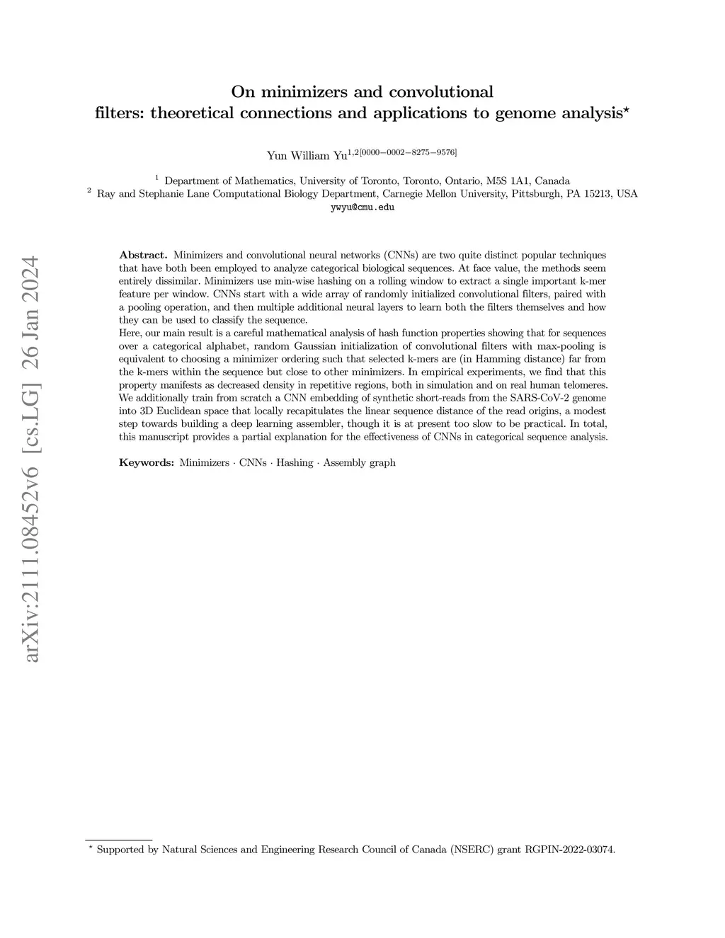 Minimizers and convolutional neural networks (CNNs) are two quite distinct popular techniques that have both been employed to analyze categorical biological sequences. At face value, the methods seem entirely dissimilar. Minimizers use min-wise hashing on a rolling window to extract a single important k-mer feature per window. CNNs start with a wide array of randomly initialized convolutional filters, paired with a pooling operation, and then multiple additional neural layers to learn both the filters themselves and how they can be used to classify the sequence. Here, our main result is a careful mathematical analysis of hash function properties showing that for sequences over a categorical alphabet, random Gaussian initialization of convolutional filters with max-pooling is equivalent to choosing a minimizer ordering such that selected k-mers are (in Hamming distance) far from the k-mers within the sequence but close to other minimizers. In empirical experiments, we find that this property manifests as decreased density in repetitive regions, both in simulation and on real human telomeres. We additionally train from scratch a CNN embedding of synthetic short-reads from the SARS-CoV-2 genome into 3D Euclidean space that locally recapitulates the linear sequence distance of the read origins, a modest step towards building a deep learning assembler, though it is at present too slow to be practical. In total, this manuscript provides a partial explanation for the effectiveness of CNNs in categorical sequence analysis.