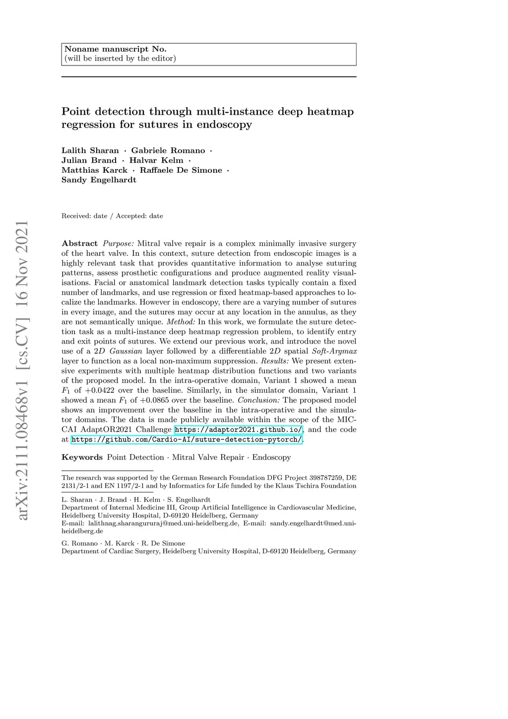 Purpose: Mitral valve repair is a complex minimally invasive surgery of the heart valve. In this context, suture detection from endoscopic images is a highly relevant task that provides quantitative information to analyse suturing patterns, assess prosthetic configurations and produce augmented reality visualisations. Facial or anatomical landmark detection tasks typically contain a fixed number of landmarks, and use regression or fixed heatmap-based approaches to localize the landmarks. However in endoscopy, there are a varying number of sutures in every image, and the sutures may occur at any location in the annulus, as they are not semantically unique. Method: In this work, we formulate the suture detection task as a multi-instance deep heatmap regression problem, to identify entry and exit points of sutures. We extend our previous work, and introduce the novel use of a 2D Gaussian layer followed by a differentiable 2D spatial Soft-Argmax layer to function as a local non-maximum suppression. Results: We present extensive experiments with multiple heatmap distribution functions and two variants of the proposed model. In the intra-operative domain, Variant 1 showed a mean F1 of +0.0422 over the baseline. Similarly, in the simulator domain, Variant 1 showed a mean F1 of +0.0865 over the baseline. Conclusion: The proposed model shows an improvement over the baseline in the intra-operative and the simulator domains. The data is made publicly available within the scope of the MICCAI AdaptOR2021 Challenge https://adaptor2021.github.io/, and the code at https://github.com/Cardio-AI/suture-detection-pytorch/. DOI:10.1007/s11548-021-02523-w. The link to the open access article can be found here: https://link.springer.com/article/10.1007%2Fs11548-021-02523-w