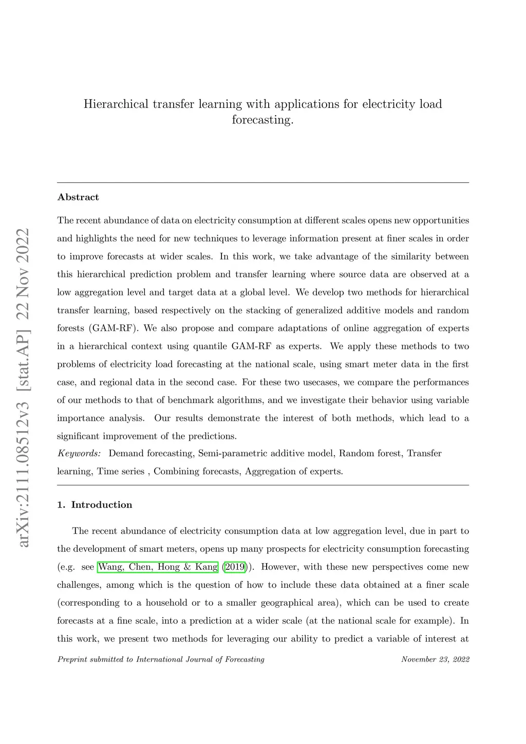 The recent abundance of data on electricity consumption at different scales opens new challenges and highlights the need for new techniques to leverage information present at finer scales in order to improve forecasts at wider scales. In this work, we take advantage of the similarity between this hierarchical prediction problem and multi-scale transfer learning. We develop two methods for hierarchical transfer learning, based respectively on the stacking of generalized additive models and random forests, and on the use of aggregation of experts. We apply these methods to two problems of electricity load forecasting at national scale, using smart meter data in the first case, and regional data in the second case. For these two usecases, we compare the performances of our methods to that of benchmark algorithms, and we investigate their behaviour using variable importance analysis. Our results demonstrate the interest of both methods, which lead to a significant improvement of the predictions.