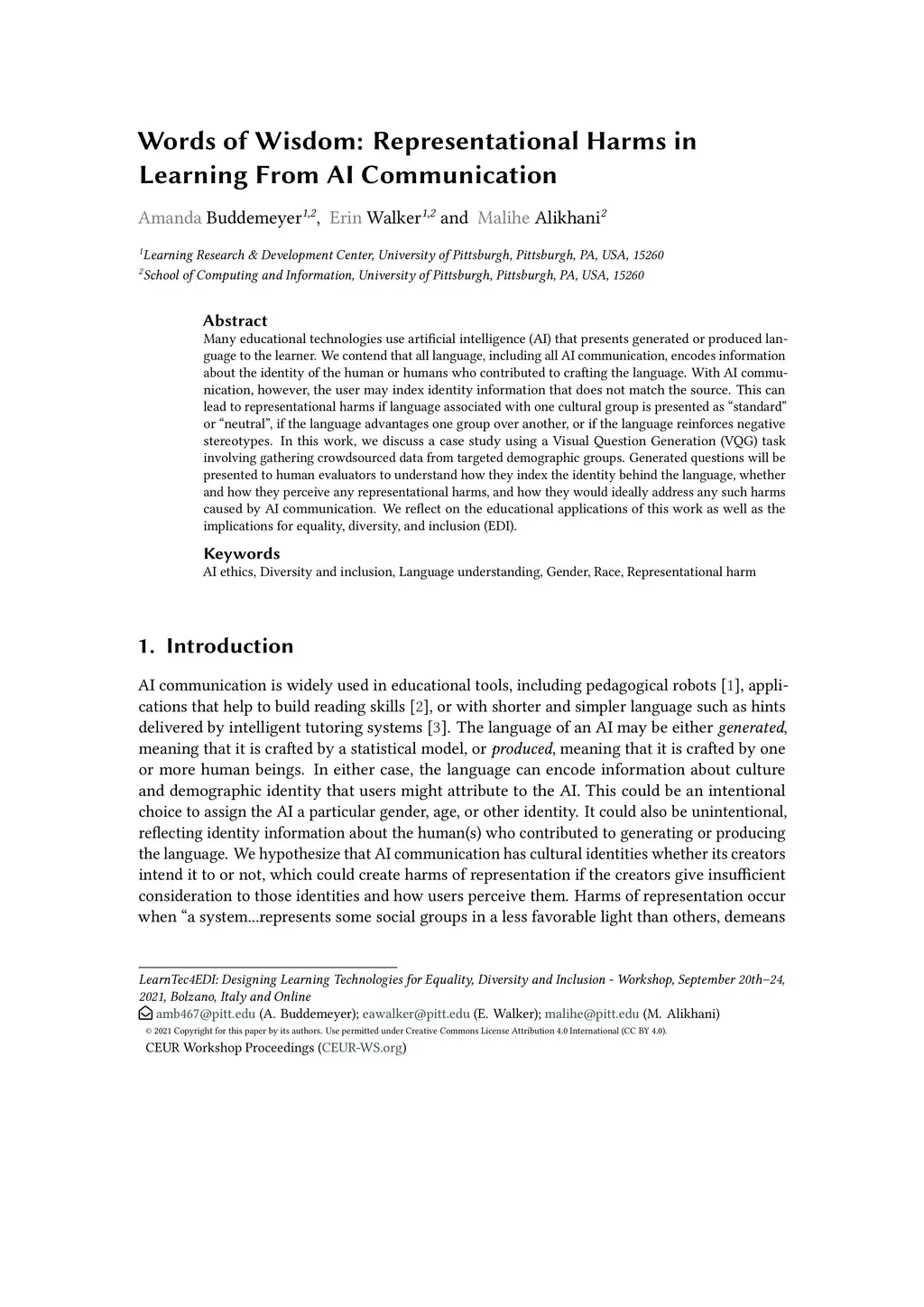 Many educational technologies use artificial intelligence (AI) that presents generated or produced language to the learner. We contend that all language, including all AI communication, encodes information about the identity of the human or humans who contributed to crafting the language. With AI communication, however, the user may index identity information that does not match the source. This can lead to representational harms if language associated with one cultural group is presented as "standard" or "neutral", if the language advantages one group over another, or if the language reinforces negative stereotypes. In this work, we discuss a case study using a Visual Question Generation (VQG) task involving gathering crowdsourced data from targeted demographic groups. Generated questions will be presented to human evaluators to understand how they index the identity behind the language, whether and how they perceive any representational harms, and how they would ideally address any such harms caused by AI communication. We reflect on the educational applications of this work as well as the implications for equality, diversity, and inclusion (EDI).