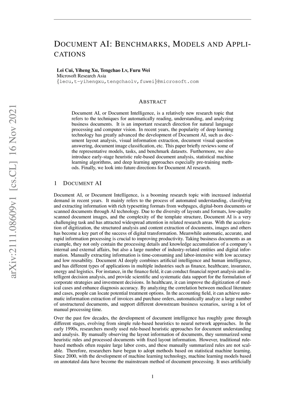Document AI, or Document Intelligence, is a relatively new research topic that refers to the techniques for automatically reading, understanding, and analyzing business documents. It is an important research direction for natural language processing and computer vision. In recent years, the popularity of deep learning technology has greatly advanced the development of Document AI, such as document layout analysis, visual information extraction, document visual question answering, document image classification, etc. This paper briefly reviews some of the representative models, tasks, and benchmark datasets. Furthermore, we also introduce early-stage heuristic rule-based document analysis, statistical machine learning algorithms, and deep learning approaches especially pre-training methods. Finally, we look into future directions for Document AI research.