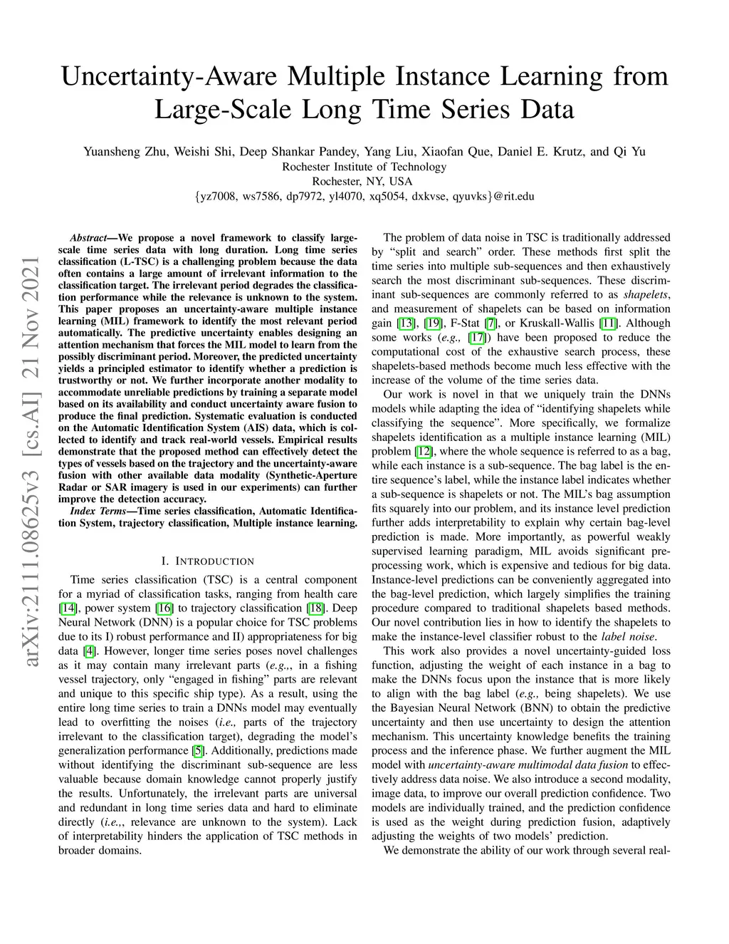 We propose a novel framework to classify large-scale time series data with long duration. Long time seriesclassification (L-TSC) is a challenging problem because the dataoften contains a large amount of irrelevant information to theclassification target. The irrelevant period degrades the classifica-tion performance while the relevance is unknown to the system.This paper proposes an uncertainty-aware multiple instancelearning (MIL) framework to identify the most relevant periodautomatically. The predictive uncertainty enables designing anattention mechanism that forces the MIL model to learn from thepossibly discriminant period. Moreover, the predicted uncertaintyyields a principled estimator to identify whether a prediction istrustworthy or not. We further incorporate another modality toaccommodate unreliable predictions by training a separate modelbased on its availability and conduct uncertainty aware fusion toproduce the final prediction. Systematic evaluation is conductedon the Automatic Identification System (AIS) data, which is col-lected to identify and track real-world vessels. Empirical resultsdemonstrate that the proposed method can effectively detect thetypes of vessels based on the trajectory and the uncertainty-awarefusion with other available data modality (Synthetic-ApertureRadar or SAR imagery is used in our experiments) can furtherimprove the detection accuracy.