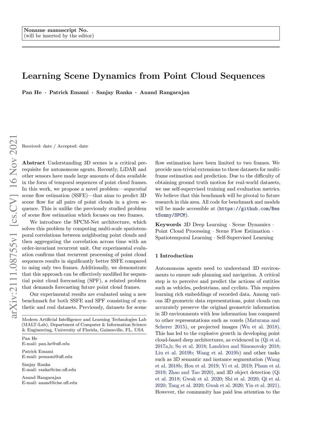 Understanding 3D scenes is a critical prerequisite for autonomous agents. Recently, LiDAR and other sensors have made large amounts of data available in the form of temporal sequences of point cloud frames. In this work, we propose a novel problem -- sequential scene flow estimation (SSFE) -- that aims to predict 3D scene flow for all pairs of point clouds in a given sequence. This is unlike the previously studied problem of scene flow estimation which focuses on two frames. We introduce the SPCM-Net architecture, which solves this problem by computing multi-scale spatiotemporal correlations between neighboring point clouds and then aggregating the correlation across time with an order-invariant recurrent unit. Our experimental evaluation confirms that recurrent processing of point cloud sequences results in significantly better SSFE compared to using only two frames. Additionally, we demonstrate that this approach can be effectively modified for sequential point cloud forecasting (SPF), a related problem that demands forecasting future point cloud frames. Our experimental results are evaluated using a new benchmark for both SSFE and SPF consisting of synthetic and real datasets. Previously, datasets for scene flow estimation have been limited to two frames. We provide non-trivial extensions to these datasets for multi-frame estimation and prediction. Due to the difficulty of obtaining ground truth motion for real-world datasets, we use self-supervised training and evaluation metrics. We believe that this benchmark will be pivotal to future research in this area. All code for benchmark and models will be made accessible.