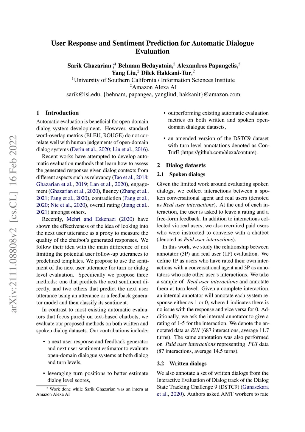 User Response and Sentiment Prediction for Automatic Dialogue Evaluation