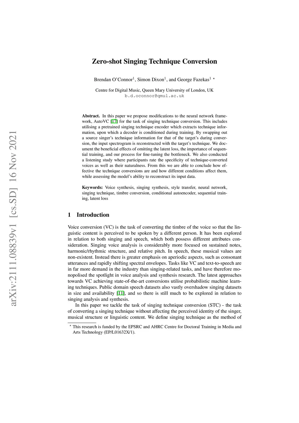 In this paper we propose modifications to the neural network framework, AutoVC for the task of singing technique conversion. This includes utilising a pretrained singing technique encoder which extracts technique information, upon which a decoder is conditioned during training. By swapping out a source singer's technique information for that of the target's during conversion, the input spectrogram is reconstructed with the target's technique. We document the beneficial effects of omitting the latent loss, the importance of sequential training, and our process for fine-tuning the bottleneck. We also conducted a listening study where participants rate the specificity of technique-converted voices as well as their naturalness. From this we are able to conclude how effective the technique conversions are and how different conditions affect them, while assessing the model's ability to reconstruct its input data.