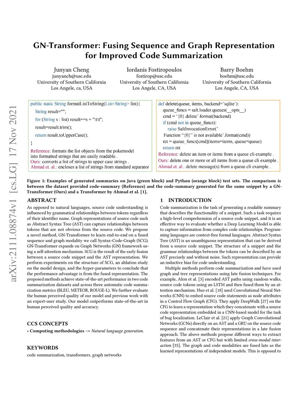 As opposed to natural languages, source code understanding is influenced by grammatical relationships between tokens regardless of their identifier name. Graph representations of source code such as Abstract Syntax Tree (AST) can capture relationships between tokens that are not obvious from the source code. We propose a novel method, GN-Transformer to learn end-to-end on a fused sequence and graph modality we call Syntax-Code-Graph (SCG). GN-Transformer expands on Graph Networks (GN) framework using a self-attention mechanism. SCG is the result of the early fusion between a source code snippet and the AST representation. We perform experiments on the structure of SCG, an ablation study on the model design, and the hyper-parameters to conclude that the performance advantage is from the fused representation. The proposed methods achieve state-of-the-art performance in two code summarization datasets and across three automatic code summarization metrics (BLEU, METEOR, ROUGE-L). We further evaluate the human perceived quality of our model and previous work with an expert-user study. Our model outperforms the state-of-the-art in human perceived quality and accuracy.