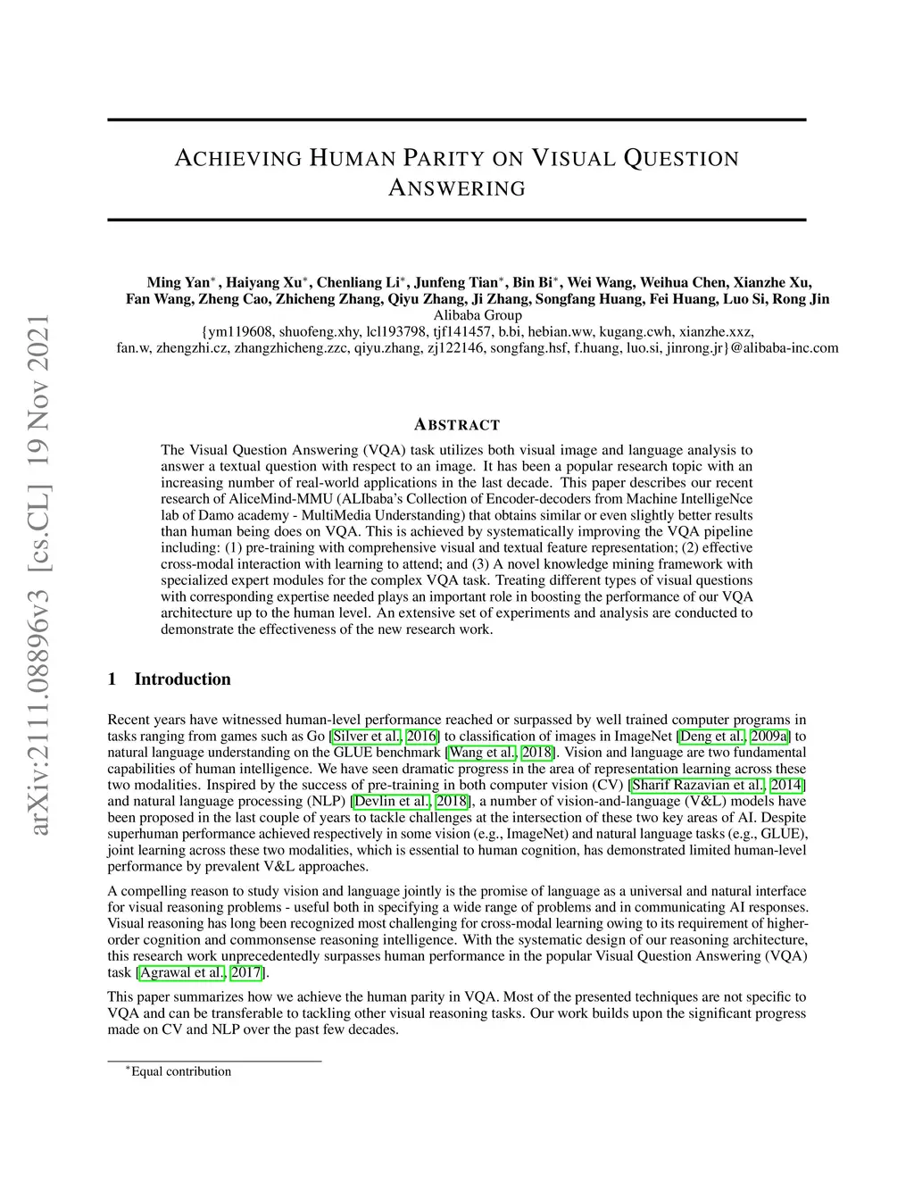 The Visual Question Answering (VQA) task utilizes both visual image and language analysis to answer a textual question with respect to an image. It has been a popular research topic with an increasing number of real-world applications in the last decade. This paper describes our recent research of AliceMind-MMU (ALIbaba's Collection of Encoder-decoders from Machine IntelligeNce lab of Damo academy - MultiMedia Understanding) that obtains similar or even slightly better results than human being does on VQA. This is achieved by systematically improving the VQA pipeline including: (1) pre-training with comprehensive visual and textual feature representation; (2) effective cross-modal interaction with learning to attend; and (3) A novel knowledge mining framework with specialized expert modules for the complex VQA task. Treating different types of visual questions with corresponding expertise needed plays an important role in boosting the performance of our VQA architecture up to the human level. An extensive set of experiments and analysis are conducted to demonstrate the effectiveness of the new research work.