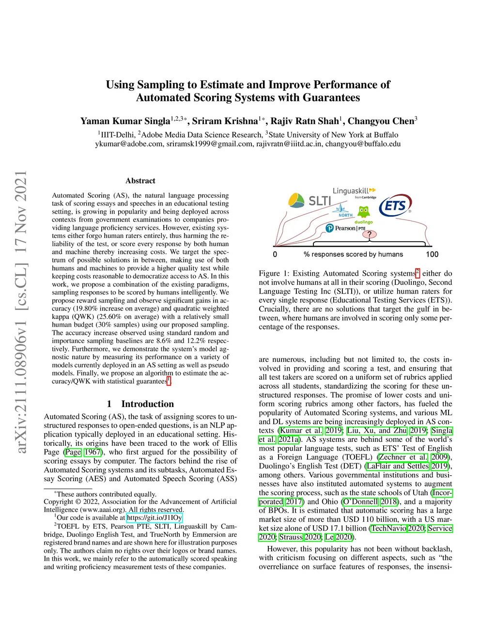 Automated Scoring (AS), the natural language processing task of scoring essays and speeches in an educational testing setting, is growing in popularity and being deployed across contexts from government examinations to companies providing language proficiency services. However, existing systems either forgo human raters entirely, thus harming the reliability of the test, or score every response by both human and machine thereby increasing costs. We target the spectrum of possible solutions in between, making use of both humans and machines to provide a higher quality test while keeping costs reasonable to democratize access to AS. In this work, we propose a combination of the existing paradigms, sampling responses to be scored by humans intelligently. We propose reward sampling and observe significant gains in accuracy (19.80% increase on average) and quadratic weighted kappa (QWK) (25.60% on average) with a relatively small human budget (30% samples) using our proposed sampling. The accuracy increase observed using standard random and importance sampling baselines are 8.6% and 12.2% respectively. Furthermore, we demonstrate the system's model agnostic nature by measuring its performance on a variety of models currently deployed in an AS setting as well as pseudo models. Finally, we propose an algorithm to estimate the accuracy/QWK with statistical guarantees (Our code is available at https://git.io/J1IOy).