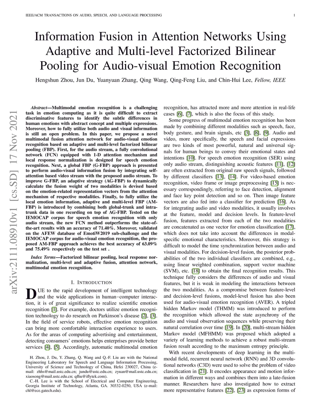 Factorized Bilinear Pooling for Audio-visual Emotion Recognition