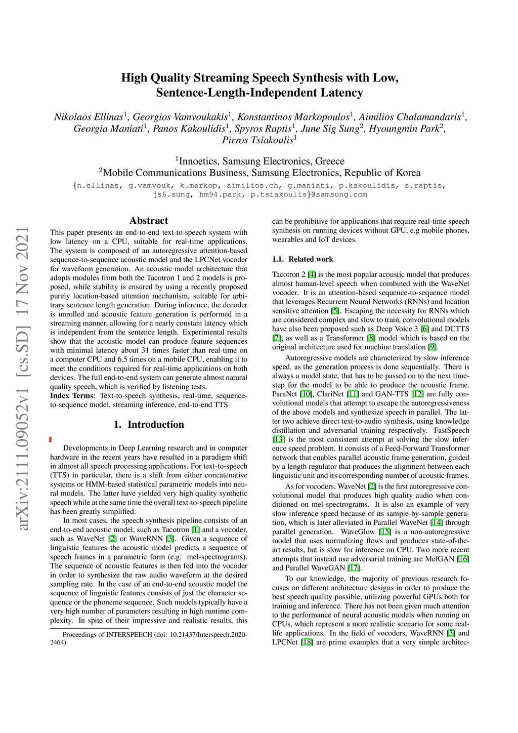 This paper presents an end-to-end text-to-speech system with low latency on a CPU, suitable for real-time applications. The system is composed of an autoregressive attention-based sequence-to-sequence acoustic model and the LPCNet vocoder for waveform generation. An acoustic model architecture that adopts modules from both the Tacotron 1 and 2 models is proposed, while stability is ensured by using a recently proposed purely location-based attention mechanism, suitable for arbitrary sentence length generation. During inference, the decoder is unrolled and acoustic feature generation is performed in a streaming manner, allowing for a nearly constant latency which is independent from the sentence length. Experimental results show that the acoustic model can produce feature sequences with minimal latency about 31 times faster than real-time on a computer CPU and 6.5 times on a mobile CPU, enabling it to meet the conditions required for real-time applications on both devices. The full end-to-end system can generate almost natural quality speech, which is verified by listening tests.