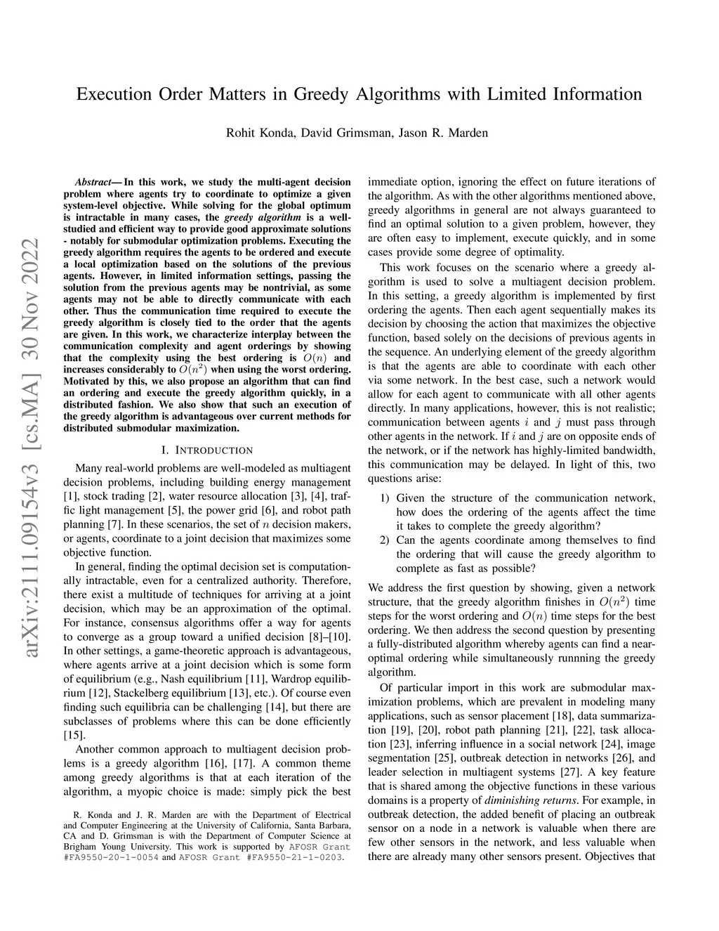 In this work, we study the multi-agent decision problem where agents try to coordinate to optimize a given system-level objective. While solving for the global optimal is intractable in many cases, the greedy algorithm is a well-studied and efficient way to provide good approximate solutions - notably for submodular optimization problems. Executing the greedy algorithm requires the agents to be ordered and execute a local optimization based on the solutions of the previous agents. However, in limited information settings, passing the solution from the previous agents may be nontrivial, as some agents may not be able to directly communicate with each other. Thus the communication time required to execute the greedy algorithm is closely tied to the order that the agents are given. In this work, we characterize interplay between the communication complexity and agent orderings by showing that the complexity using the best ordering is O(n) and increases considerably to O(n^2) when using the worst ordering. Motivated by this, we also propose an algorithm that can find an ordering and execute the greedy algorithm quickly, in a distributed fashion. We also show that such an execution of the greedy algorithm is advantageous over current methods for distributed submodular maximization.