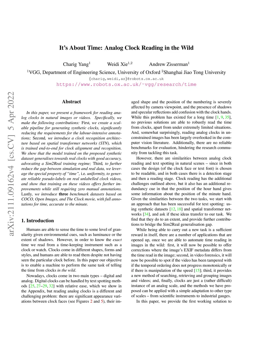 In this paper, we present a framework for reading analog clocks in natural images or videos. Specifically, we make the following contributions: First, we create a scalable pipeline for generating synthetic clocks, significantly reducing the requirements for the labour-intensive annotations; Second, we introduce a clock recognition architecture based on spatial transformer networks (STN), which is trained end-to-end for clock alignment and recognition. We show that the model trained on the proposed synthetic dataset generalises towards real clocks with good accuracy, advocating a Sim2Real training regime; Third, to further reduce the gap between simulation and real data, we leverage the special property of "time", i.e.uniformity, to generate reliable pseudo-labels on real unlabelled clock videos, and show that training on these videos offers further improvements while still requiring zero manual annotations. Lastly, we introduce three benchmark datasets based on COCO, Open Images, and The Clock movie, with full annotations for time, accurate to the minute.