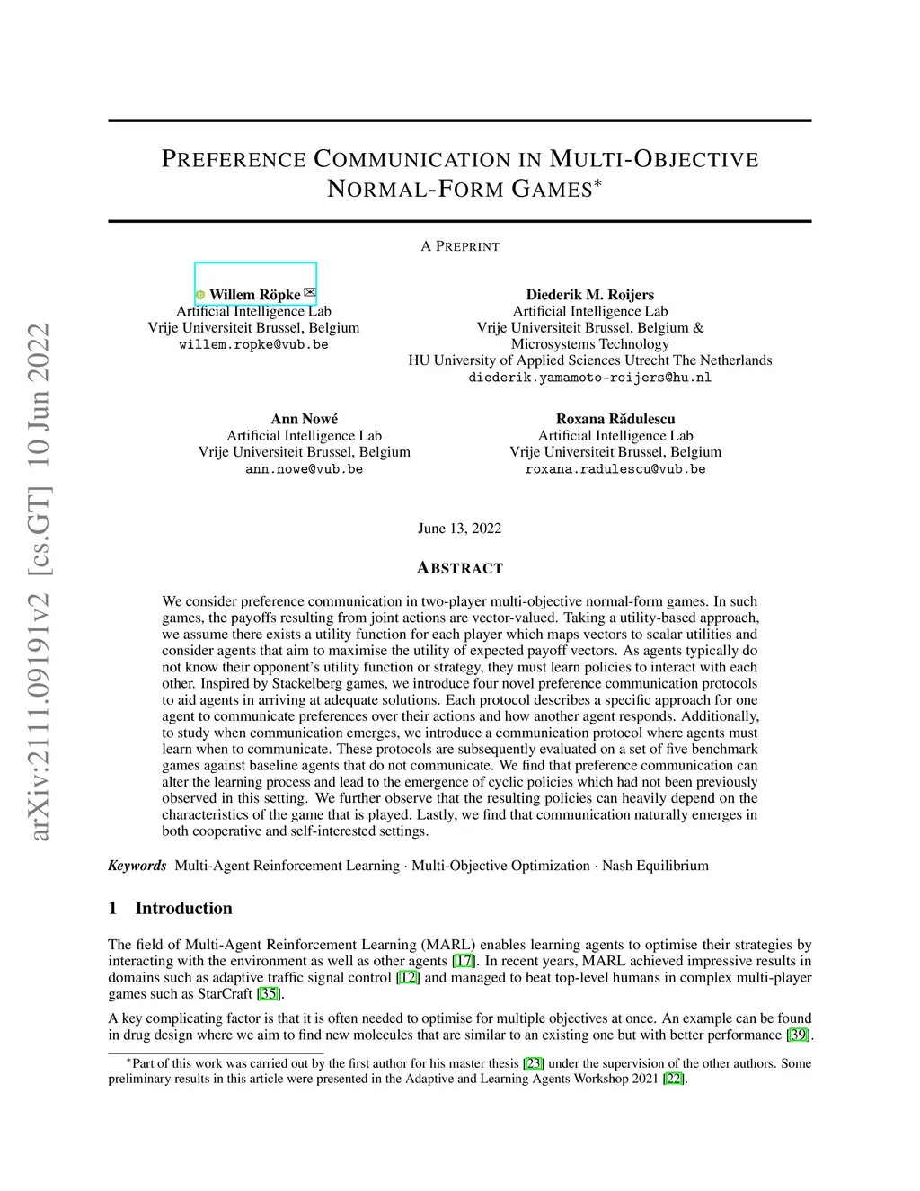 We consider preference communication in two-player multi-objective normal-form games. In such games, the payoffs resulting from joint actions are vector-valued. Taking a utility-based approach, we assume there exists a utility function for each player which maps vectors to scalar utilities and consider agents that aim to maximise the utility of expected payoff vectors. As agents typically do not know their opponent's utility function or strategy, they must learn policies to interact with each other. Inspired by Stackelberg games, we introduce four novel preference communication protocols to aid agents in arriving at adequate solutions. Each protocol describes a specific approach for one agent to communicate preferences over their actions and how another agent responds. Additionally, to study when communication emerges, we introduce a communication protocol where agents must learn when to communicate. These protocols are subsequently evaluated on a set of five benchmark games against baseline agents that do not communicate. We find that preference communication can alter the learning process and lead to the emergence of cyclic policies which had not been previously observed in this setting. We further observe that the resulting policies can heavily depend on the characteristics of the game that is played. Lastly, we find that communication naturally emerges in both cooperative and self-interested settings.