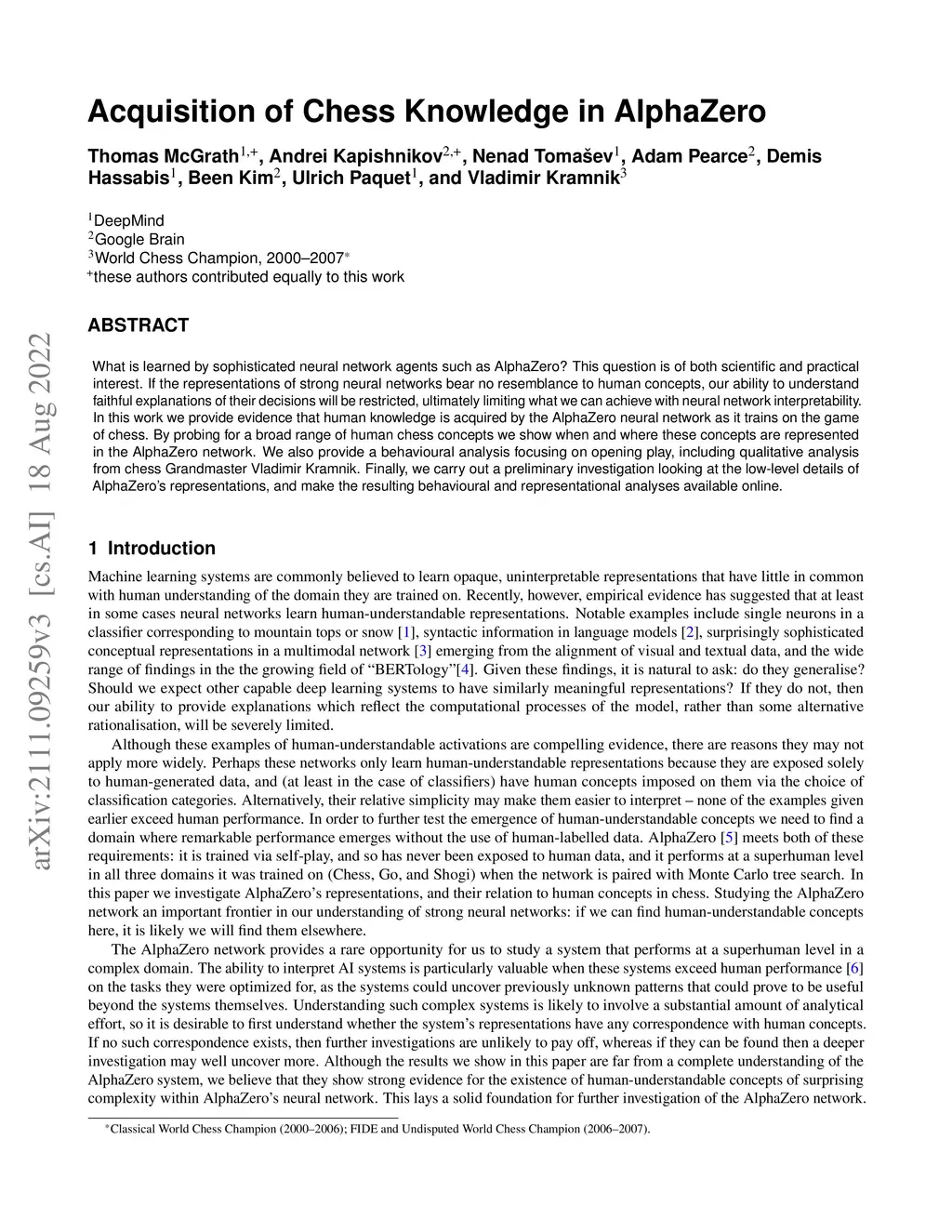What is learned by sophisticated neural network agents such as AlphaZero? This question is of both scientific and practical interest. If the representations of strong neural networks bear no resemblance to human concepts, our ability to understand faithful explanations of their decisions will be restricted, ultimately limiting what we can achieve with neural network interpretability. In this work we provide evidence that human knowledge is acquired by the AlphaZero neural network as it trains on the game of chess. By probing for a broad range of human chess concepts we show when and where these concepts are represented in the AlphaZero network. We also provide a behavioural analysis focusing on opening play, including qualitative analysis from chess Grandmaster Vladimir Kramnik. Finally, we carry out a preliminary investigation looking at the low-level details of AlphaZero's representations, and make the resulting behavioural and representational analyses available online.