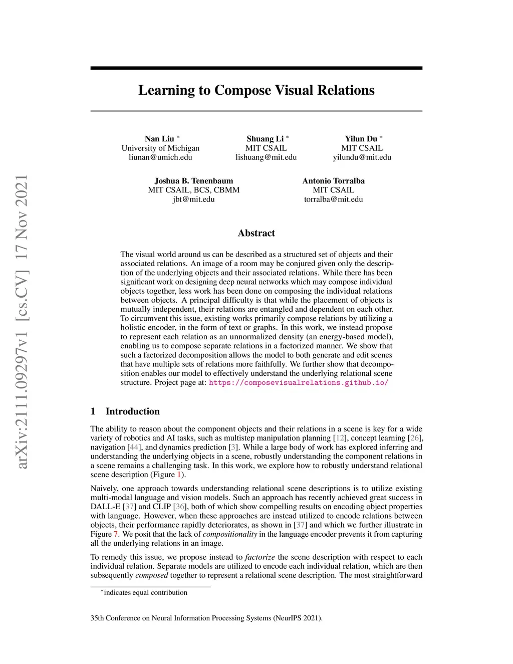 The visual world around us can be described as a structured set of objects and their associated relations. An image of a room may be conjured given only the description of the underlying objects and their associated relations. While there has been significant work on designing deep neural networks which may compose individual objects together, less work has been done on composing the individual relations between objects. A principal difficulty is that while the placement of objects is mutually independent, their relations are entangled and dependent on each other. To circumvent this issue, existing works primarily compose relations by utilizing a holistic encoder, in the form of text or graphs. In this work, we instead propose to represent each relation as an unnormalized density (an energy-based model), enabling us to compose separate relations in a factorized manner. We show that such a factorized decomposition allows the model to both generate and edit scenes that have multiple sets of relations more faithfully. We further show that decomposition enables our model to effectively understand the underlying relational scene structure. Project page at: https://composevisualrelations.github.io/.