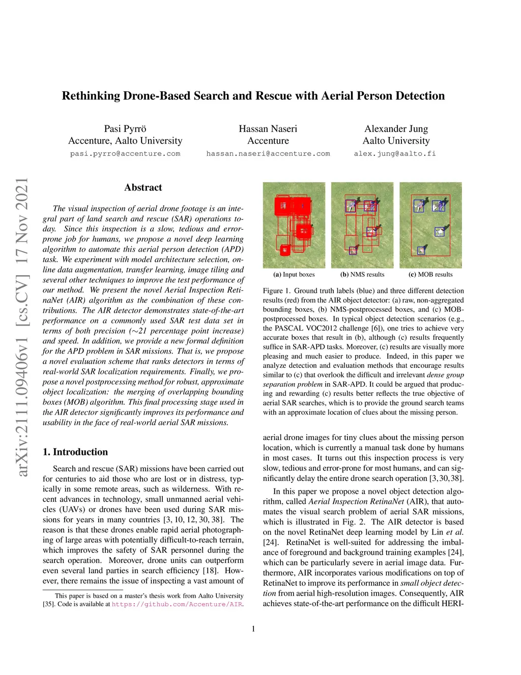 The visual inspection of aerial drone footage is an integral part of land search and rescue (SAR) operations today. Since this inspection is a slow, tedious and error-prone job for humans, we propose a novel deep learning algorithm to automate this aerial person detection (APD) task. We experiment with model architecture selection, online data augmentation, transfer learning, image tiling and several other techniques to improve the test performance of our method. We present the novel Aerial Inspection RetinaNet (AIR) algorithm as the combination of these contributions. The AIR detector demonstrates state-of-the-art performance on a commonly used SAR test data set in terms of both precision (~21 percentage point increase) and speed. In addition, we provide a new formal definition for the APD problem in SAR missions. That is, we propose a novel evaluation scheme that ranks detectors in terms of real-world SAR localization requirements. Finally, we propose a novel postprocessing method for robust, approximate object localization: the merging of overlapping bounding boxes (MOB) algorithm. This final processing stage used in the AIR detector significantly improves its performance and usability in the face of real-world aerial SAR missions.