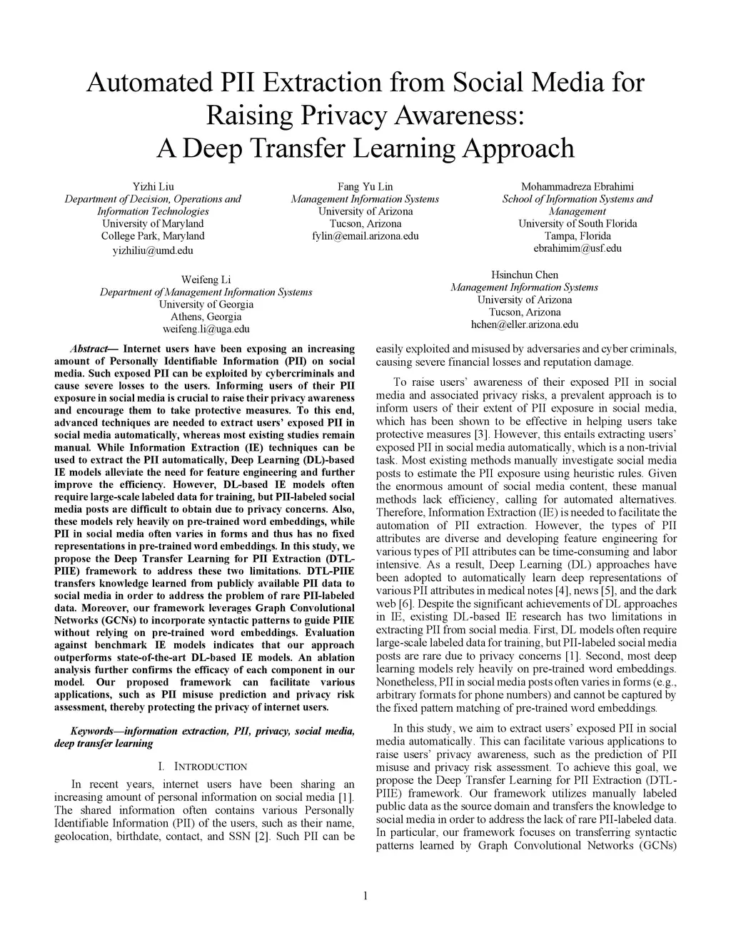 Internet users have been exposing an increasing amount of Personally Identifiable Information (PII) on social media. Such exposed PII can cause severe losses to the users, and informing users of their PII exposure is crucial to raise their privacy awareness and encourage them to take protective measures. To this end, advanced automatic techniques are needed. While Information Extraction (IE) techniques can be used to extract the PII automatically, Deep Learning (DL)-based IE models alleviate the need for feature engineering and further improve the efficiency. However, DL-based IE models often require large-scale labeled data for training, but PII-labeled social media posts are difficult to obtain due to privacy concerns. Also, these models rely heavily on pre-trained word embeddings, while PII in social media often varies in forms and thus has no fixed representations in pre-trained word embeddings. In this study, we propose the Deep Transfer Learning for PII Extraction (DTL-PIIE) framework to address these two limitations. DTL-PIIE transfers knowledge learned from publicly available PII data to social media to address the problem of rare PII-labeled data. Moreover, our framework leverages Graph Convolutional Networks (GCNs) to incorporate syntactic patterns to guide PIIE without relying on pre-trained word embeddings. Evaluation against benchmark IE models indicates that our approach outperforms state-of-the-art DL-based IE models. Our framework can facilitate various applications, such as PII misuse prediction and privacy risk assessment, protecting the privacy of internet users.