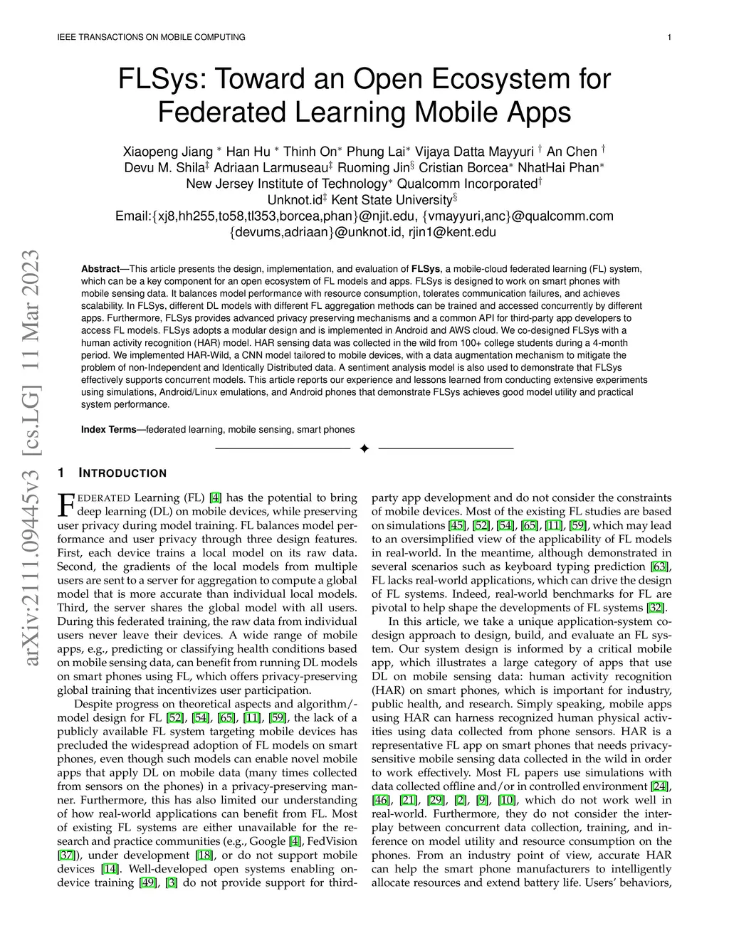 This article presents the design, implementation, and evaluation of FLSys, a mobile-cloud federated learning (FL) system, which can be a key component for an open ecosystem of FL models and apps. FLSys is designed to work on smart phones with mobile sensing data. It balances model performance with resource consumption, tolerates communication failures, and achieves scalability. In FLSys, different DL models with different FL aggregation methods can be trained and accessed concurrently by different apps. Furthermore, FLSys provides advanced privacy preserving mechanisms and a common API for third-party app developers to access FL models. FLSys adopts a modular design and is implemented in Android and AWS cloud. We co-designed FLSys with a human activity recognition (HAR) model. HAR sensing data was collected in the wild from 100+ college students during a 4-month period. We implemented HAR-Wild, a CNN model tailored to mobile devices, with a data augmentation mechanism to mitigate the problem of non-Independent and Identically Distributed data. A sentiment analysis model is also used to demonstrate that FLSys effectively supports concurrent models. This article reports our experience and lessons learned from conducting extensive experiments using simulations, Android/Linux emulations, and Android phones that demonstrate FLSys achieves good model utility and practical system performance.