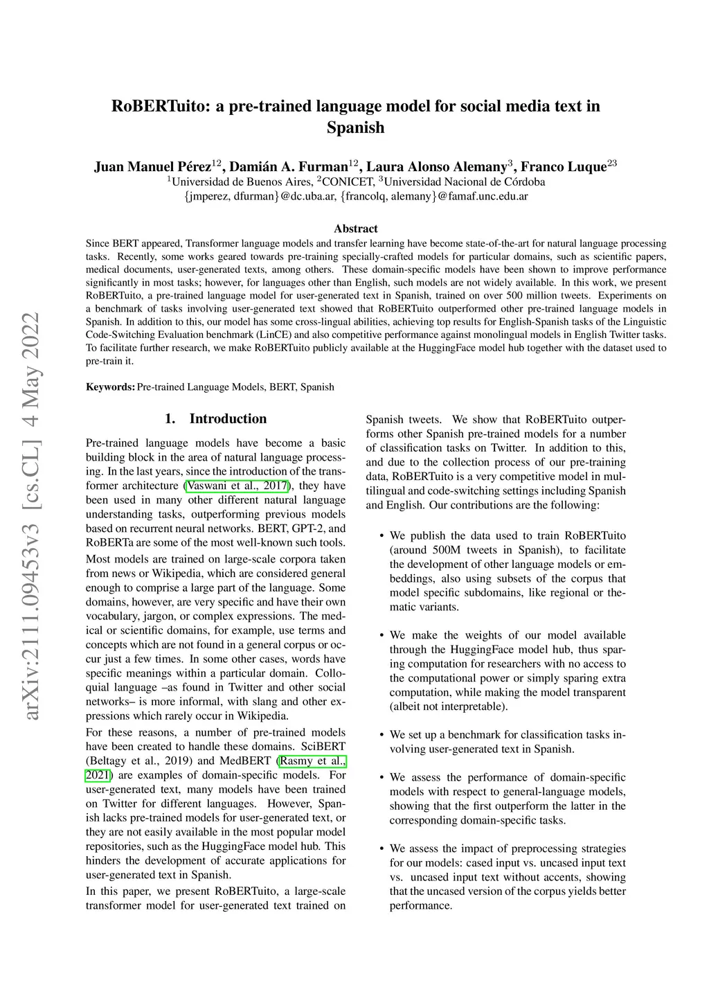 Since BERT appeared, Transformer language models and transfer learning have become state-of-the-art for Natural Language Understanding tasks. Recently, some works geared towards pre-training specially-crafted models for particular domains, such as scientific papers, medical documents, user-generated texts, among others. These domain-specific models have been shown to improve performance significantly in most tasks. However, for languages other than English such models are not widely available. In this work, we present RoBERTuito, a pre-trained language model for user-generated text in Spanish, trained on over 500 million tweets. Experiments on a benchmark of tasks involving user-generated text showed that RoBERTuito outperformed other pre-trained language models in Spanish. In addition to this, our model achieves top results for some English-Spanish tasks of the Linguistic Code-Switching Evaluation benchmark (LinCE) and has also competitive performance against monolingual models in English tasks. To facilitate further research, we make RoBERTuito publicly available at the HuggingFace model hub together with the dataset used to pre-train it.