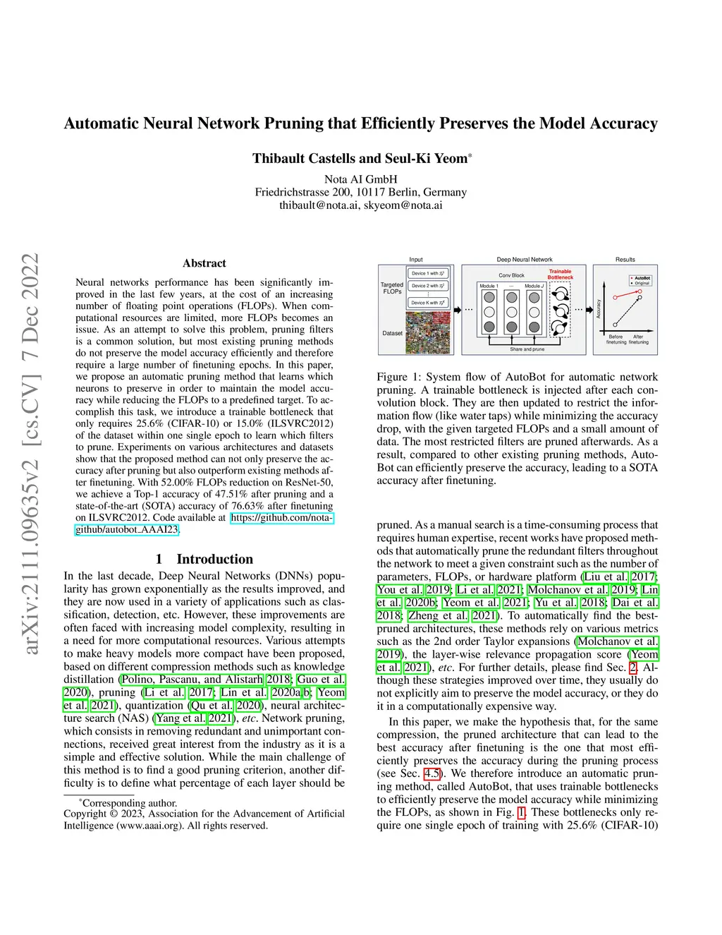 Neural networks performance has been significantly improved in the last few years, at the cost of an increasing number of floating point operations per second (FLOPs). However, more FLOPs can be an issue when computational resources are limited. As an attempt to solve this problem, pruning filters is a common solution, but most existing pruning methods do not preserve the model accuracy efficiently and therefore require a large number of finetuning epochs. In this paper, we propose an automatic pruning method that learns which neurons to preserve in order to maintain the model accuracy while reducing the FLOPs to a predefined target. To accomplish this task, we introduce a trainable bottleneck that only requires one single epoch with 25.6% (CIFAR-10) or 7.49% (ILSVRC2012) of the dataset to learn which filters to prune. Experiments on various architectures and datasets show that the proposed method can not only preserve the accuracy after pruning but also outperform existing methods after finetuning. We achieve a 52.00% FLOPs reduction on ResNet-50, with a Top-1 accuracy of 47.51% after pruning and a state-of-the-art (SOTA) accuracy of 76.63% after finetuning on ILSVRC2012. Code available at https://github.com/nota-github/autobot_AAAI23.