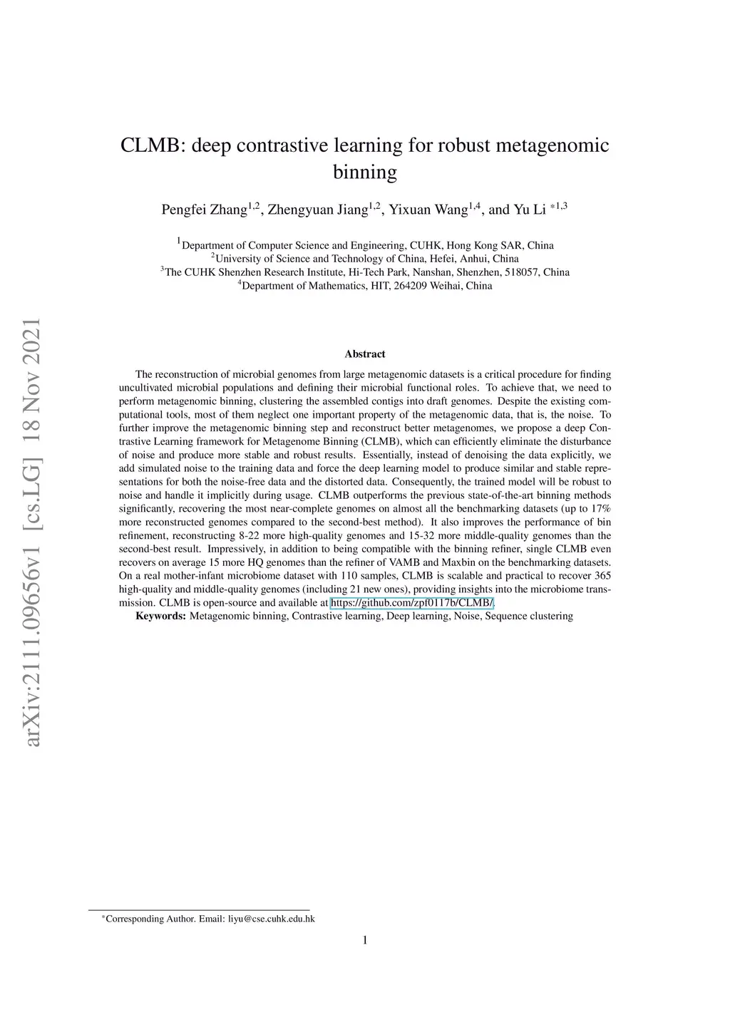 The reconstruction of microbial genomes from large metagenomic datasets is a critical procedure for finding uncultivated microbial populations and defining their microbial functional roles. To achieve that, we need to perform metagenomic binning, clustering the assembled contigs into draft genomes. Despite the existing computational tools, most of them neglect one important property of the metagenomic data, that is, the noise. To further improve the metagenomic binning step and reconstruct better metagenomes, we propose a deep Contrastive Learning framework for Metagenome Binning (CLMB), which can efficiently eliminate the disturbance of noise and produce more stable and robust results. Essentially, instead of denoising the data explicitly, we add simulated noise to the training data and force the deep learning model to produce similar and stable representations for both the noise-free data and the distorted data. Consequently, the trained model will be robust to noise and handle it implicitly during usage. CLMB outperforms the previous state-of-the-art binning methods significantly, recovering the most near-complete genomes on almost all the benchmarking datasets (up to 17\% more reconstructed genomes compared to the second-best method). It also improves the performance of bin refinement, reconstructing 8-22 more high-quality genomes and 15-32 more middle-quality genomes than the second-best result. Impressively, in addition to being compatible with the binning refiner, single CLMB even recovers on average 15 more HQ genomes than the refiner of VAMB and Maxbin on the benchmarking datasets. CLMB is open-source and available at https://github.com/zpf0117b/CLMB/.