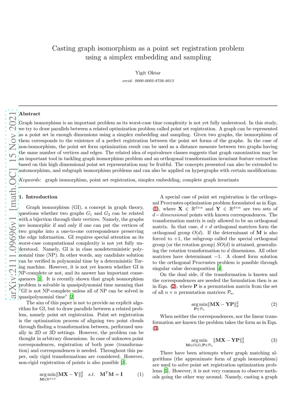 Graph isomorphism is an important problem as its worst-case time complexity is not yet fully understood. In this study, we try to draw parallels between a related optimization problem called point set registration. A graph can be represented as a point set in enough dimensions using a simplex embedding and sampling. Given two graphs, the isomorphism of them corresponds to the existence of a perfect registration between the point set forms of the graphs. In the case of non-isomorphism, the point set form optimization result can be used as a distance measure between two graphs having the same number of vertices and edges. The related idea of equivalence classes suggests that graph canonization may be an important tool in tackling graph isomorphism problem and an orthogonal transformation invariant feature extraction based on this high dimensional point set representation may be fruitful. The concepts presented can also be extended to automorphism, and subgraph isomorphism problems and can also be applied on hypergraphs with certain modifications.