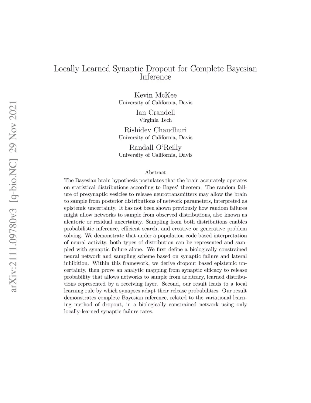 Locally Learned Synaptic Dropout for Complete Bayesian Inference