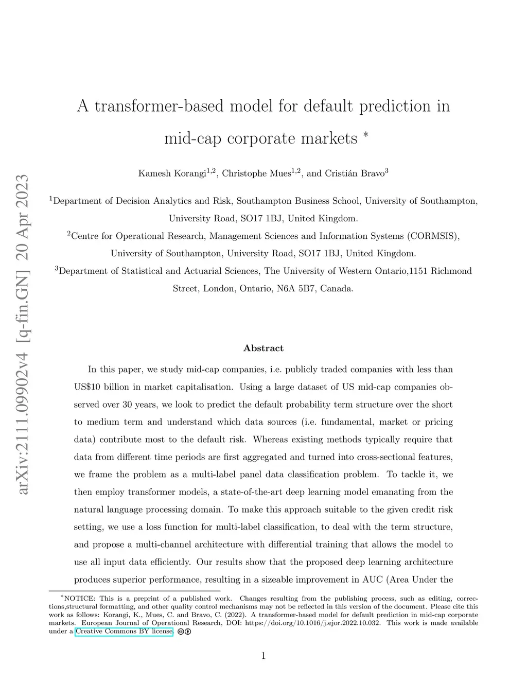 In this paper, we study mid-cap companies, i.e. publicly traded companies with less than US $10 billion in market capitalisation. Using a large dataset of US mid-cap companies observed over 30 years, we look to predict the default probability term structure over the medium term and understand which data sources (i.e. fundamental, market or pricing data) contribute most to the default risk. Whereas existing methods typically require that data from different time periods are first aggregated and turned into cross-sectional features, we frame the problem as a multi-label time-series classification problem. We adapt transformer models, a state-of-the-art deep learning model emanating from the natural language processing domain, to the credit risk modelling setting. We also interpret the predictions of these models using attention heat maps. To optimise the model further, we present a custom loss function for multi-label classification and a novel multi-channel architecture with differential training that gives the model the ability to use all input data efficiently. Our results show the proposed deep learning architecture's superior performance, resulting in a 13% improvement in AUC (Area Under the receiver operating characteristic Curve) over traditional models. We also demonstrate how to produce an importance ranking for the different data sources and the temporal relationships using a Shapley approach specific to these models.