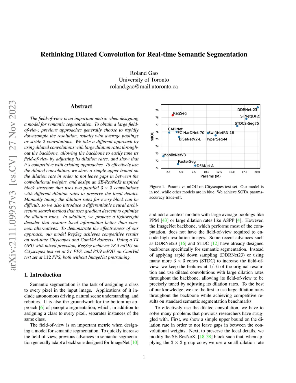 The field-of-view is an important metric when designing a model for semantic segmentation. To obtain a large field-of-view, previous approaches generally choose to rapidly downsample the resolution, usually with average poolings or stride 2 convolutions. We take a different approach by using dilated convolutions with large dilation rates throughout the backbone, allowing the backbone to easily tune its field-of-view by adjusting its dilation rates, and show that it's competitive with existing approaches. To effectively use the dilated convolution, we show a simple upper bound on the dilation rate in order to not leave gaps in between the convolutional weights, and design an SE-ResNeXt inspired block structure that uses two parallel convolutions with different dilation rates to preserve the local details. Manually tuning the dilation rates for every block can be difficult, so we also introduce a differentiable neural architecture search method that uses gradient descent to optimize the dilation rates. In addition, we propose a lightweight decoder that restores local information better than common alternatives. To demonstrate the effectiveness of our approach, our model RegSeg achieves competitive results on real-time Cityscapes and CamVid datasets. Using a T4 GPU with mixed precision, RegSeg achieves 78.3 mIOU on Cityscapes test set at FPS, and 80.9 mIOU on CamVid test set at FPS, both without ImageNet pretraining.